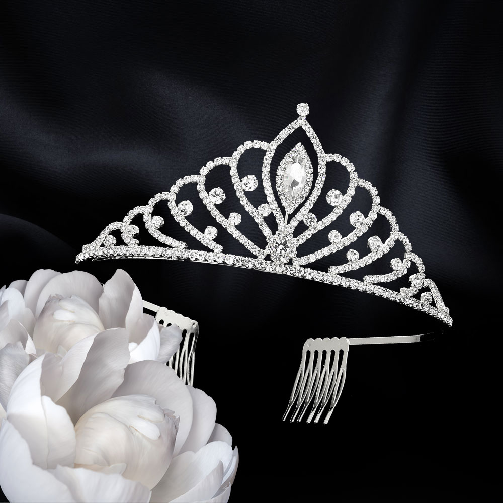 • Elevate your elegance with this radiant tiara, designed with sparkling iridescent crystal accents in a graceful fan motif. Ideal for weddings, pageants, or formal events, it offers a secure fit with comb ends and adds a refined, regal touch to any ensemble.