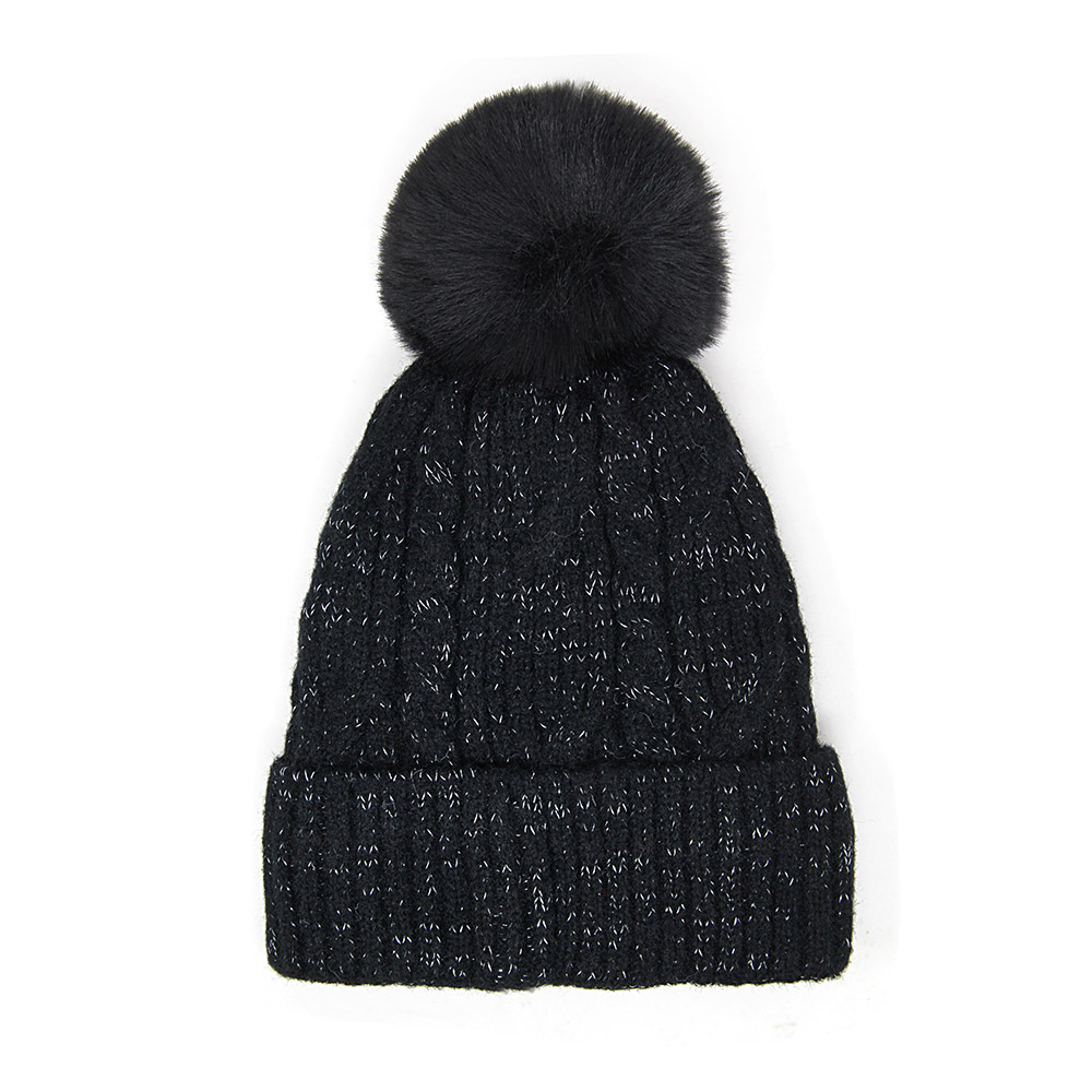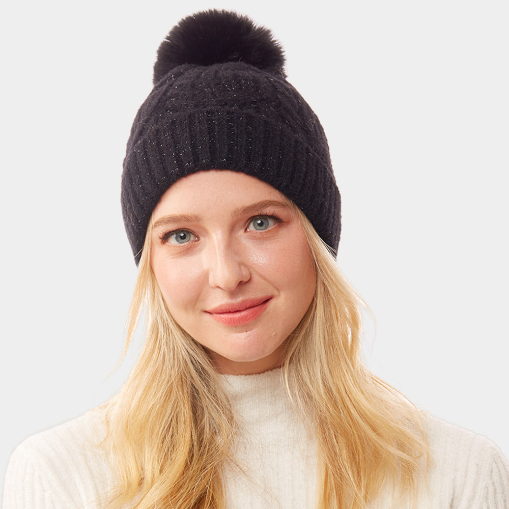 Lurex Accented Solid Cable Knitted Pom Pom Beanie Hat