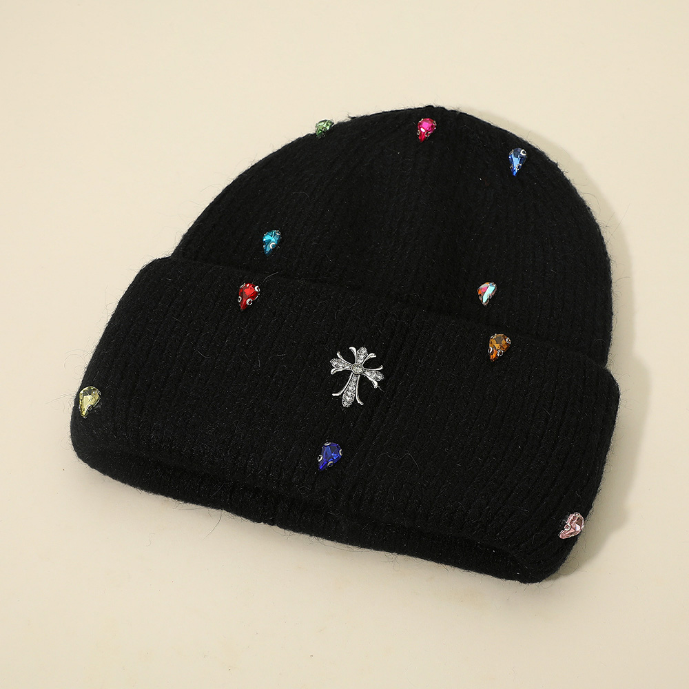Rhinestone Cross Accent Teardrop Stone Cluster Embellished Knit Beanie Hat