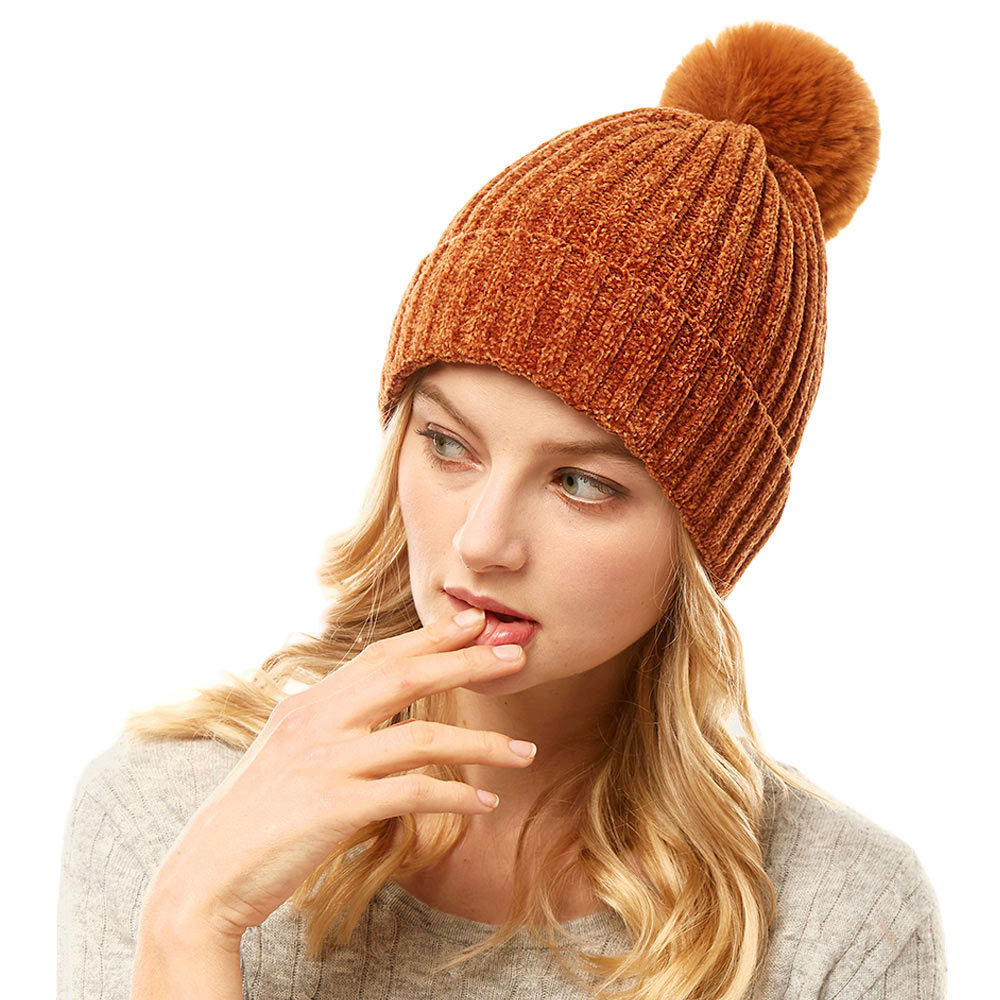-T- Initial Monogram Faux Fur Pom Pom Knit Beanie Hat