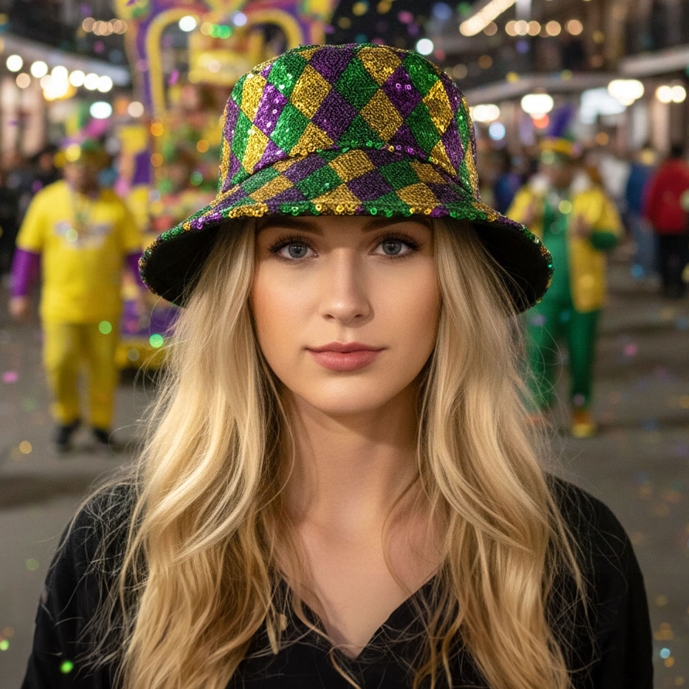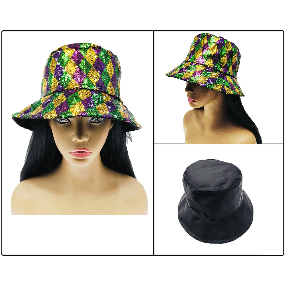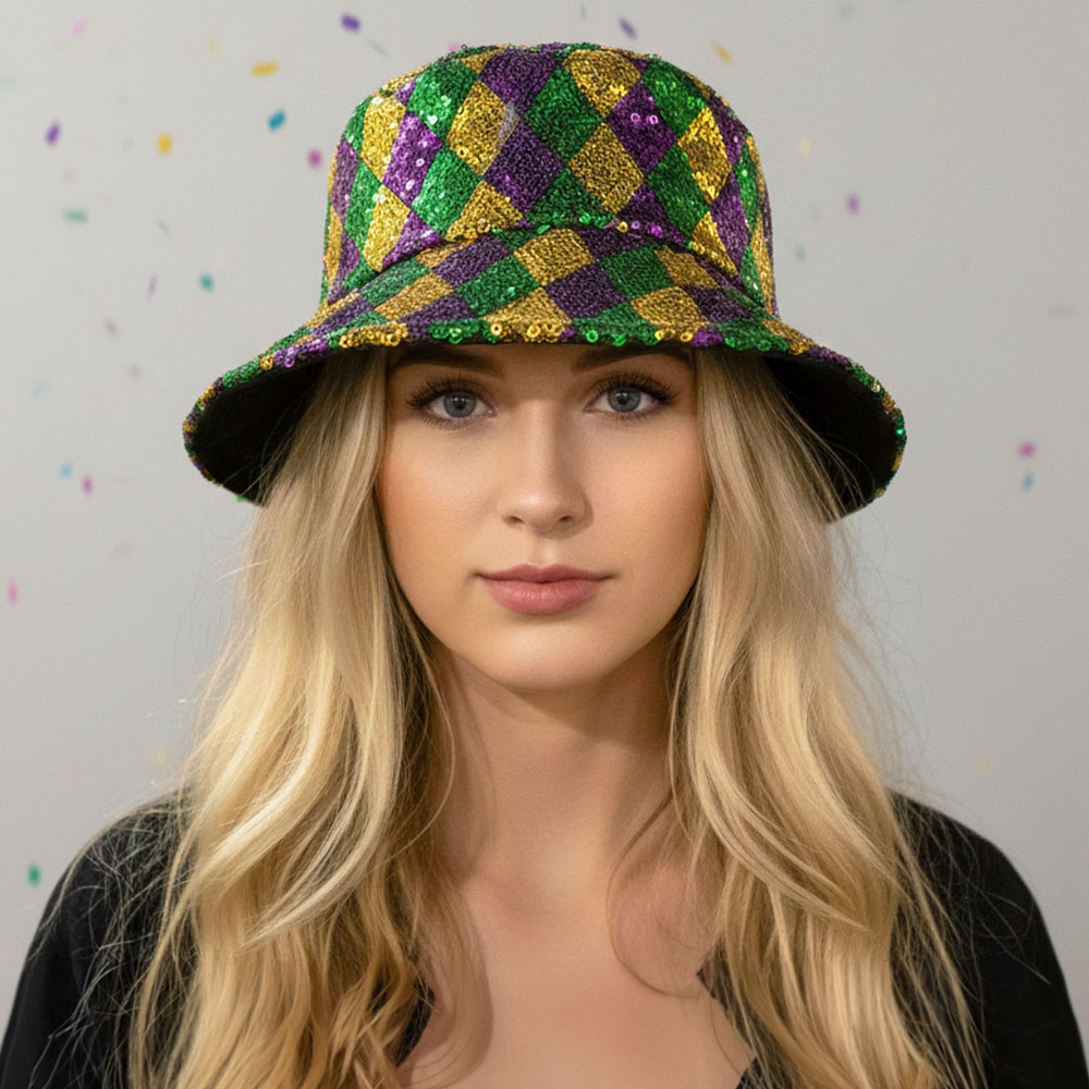 • Add statement style with this sequin diamond pattern mardi gras bucket hat featuring a bold geometric design and classic bucket silhouette. Comfortable for all-day wear and easy to style, it’s ideal for festivals, concerts, themed events, or casual outfits that need a playful, standout finishing touch.