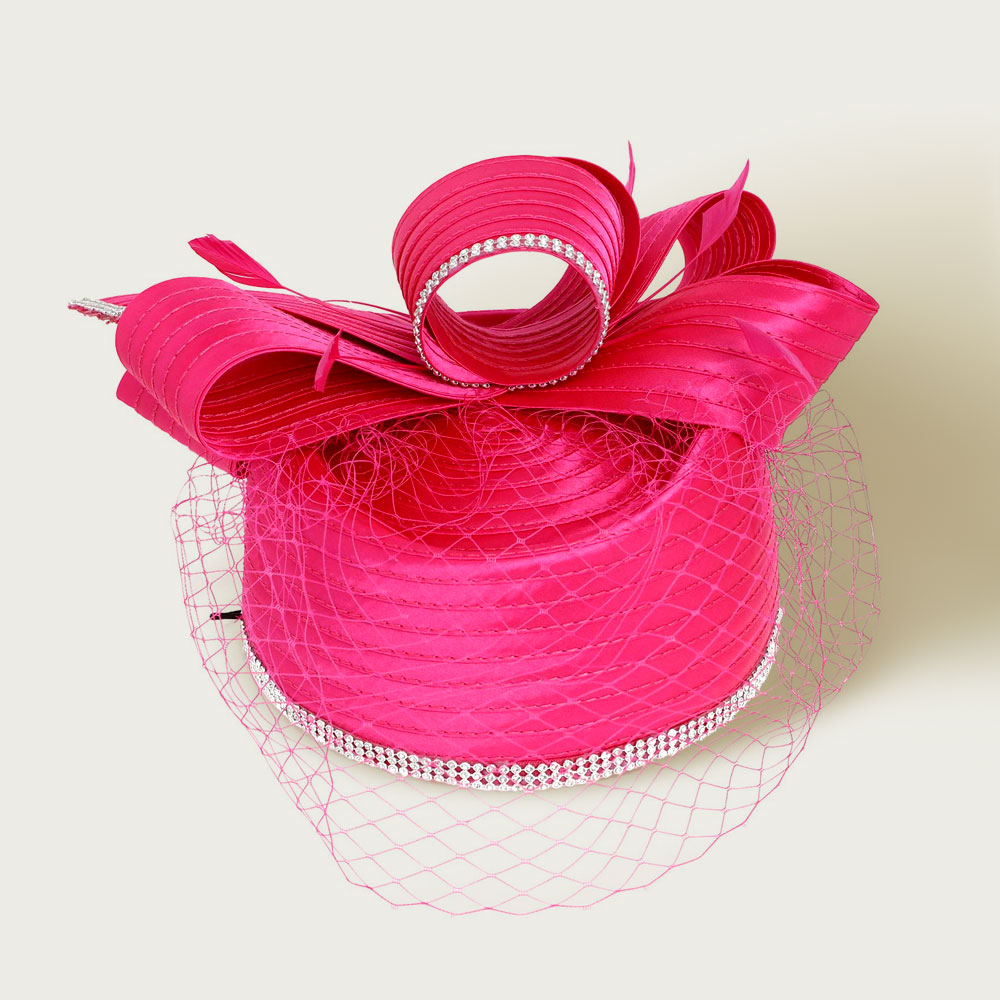 Rhinestone Rim Bow Top Feather Accented Mesh Dressy Hat