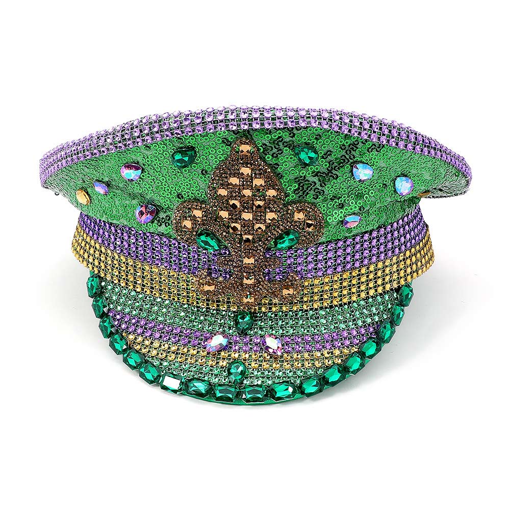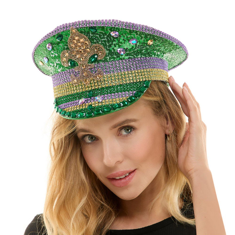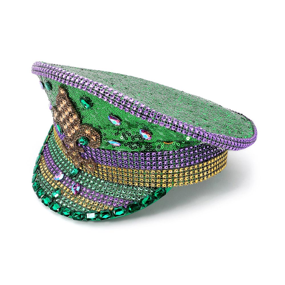 Fleur de Lis Stone Embellished Mardi Gras Sequin Captain Hat