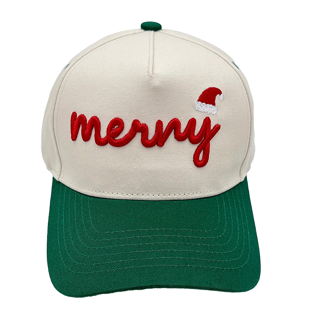 Details • Size : One Size Fits All - Adjustable Strap Makes Fit Comfortable • 5 Panel Canvas Cap : Adjustable Buckle Closure, Relaxed Fit and Pre-Curved Visor • Material : 100% Cotton • Cheerful holiday trucker hat featuring embroidered “merry” lettering with a festive Santa hat accent. Perfect for Christmas gatherings, parties, and casual winter days. Spread holiday joy and add a playful seasonal touch to your outfit with this cozy and stylish cap.