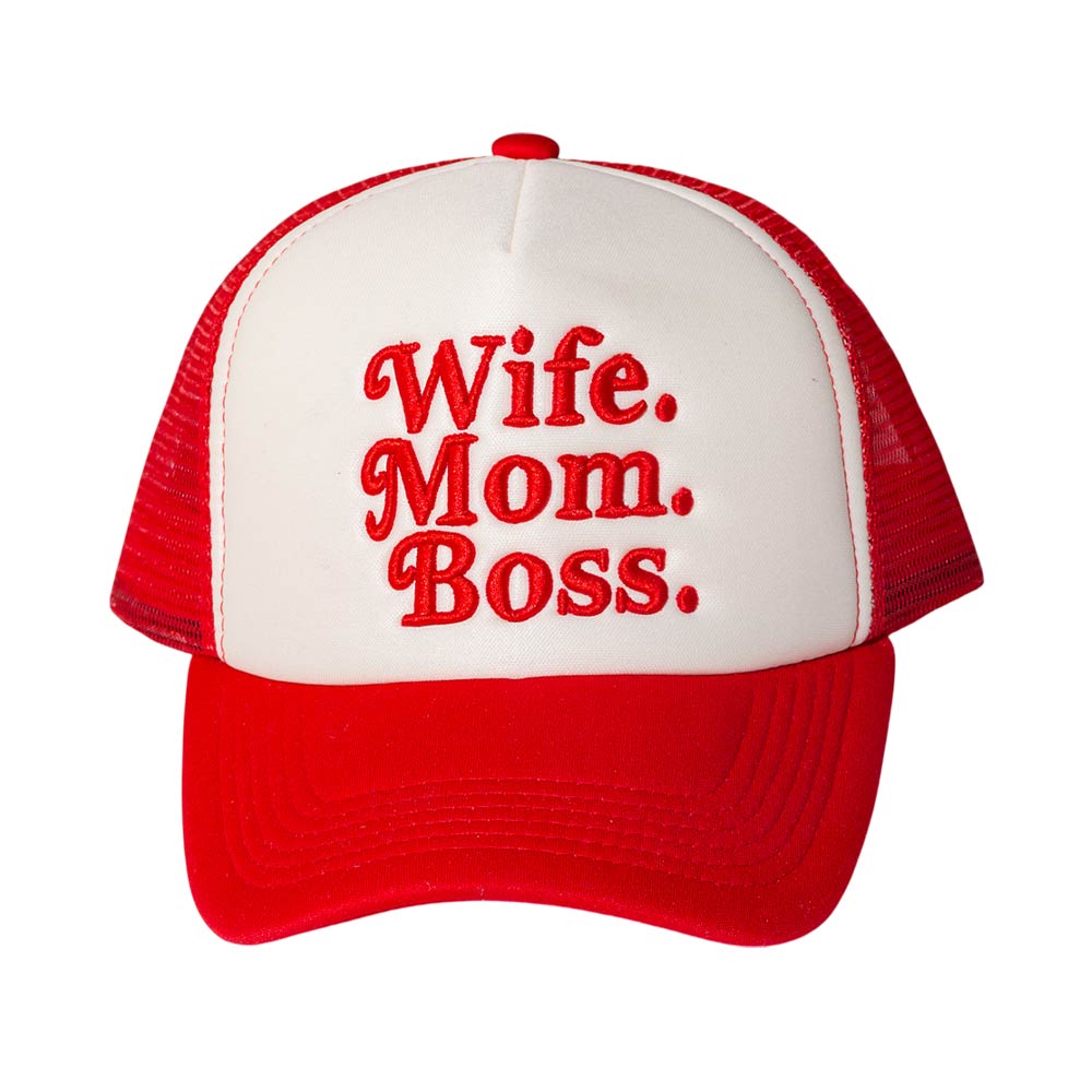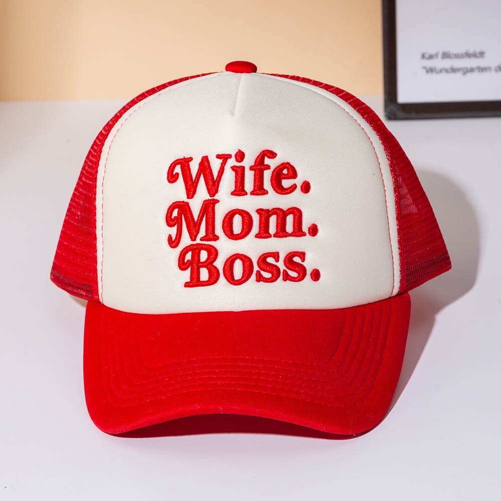 Details • Size : One Size • Confident statement trucker hat featuring “Wife. Mom. Boss.” embroidery for everyday wear. Designed for a comfortable fit with breathable construction and easy styling. Perfect for errands, travel, casual outings, or gifting with an empowering message that celebrates modern life roles.
