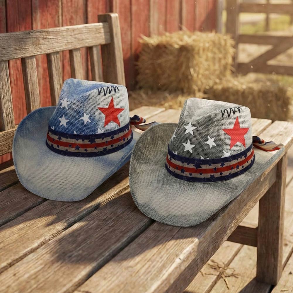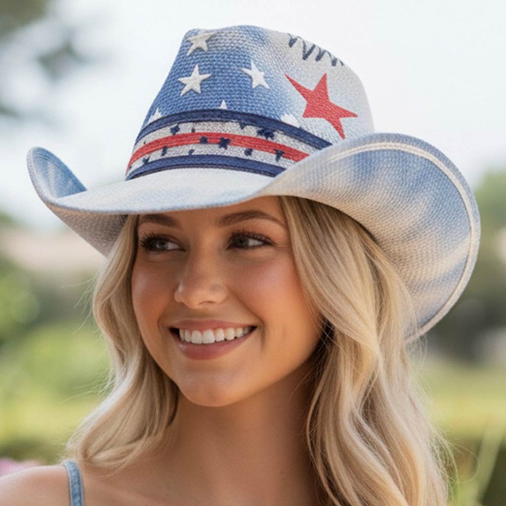 American USA Stars Stripes Print Western Straw Cowboy Hat