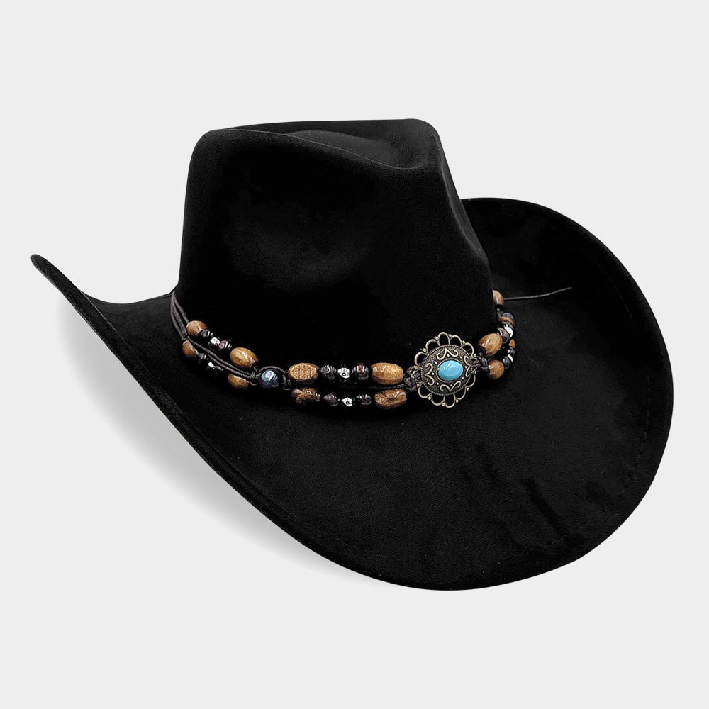 • This western-inspired cowboy hat features a classic structured silhouette accented with a decorative beaded band and centerpiece detail. Designed for statement styling, it offers a bold yet wearable look for festivals, concerts, travel, and themed events. A standout accessory for boutiques seeking eye-catching headwear with rustic character and everyday appeal.