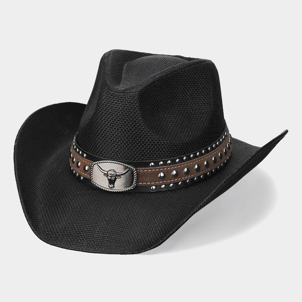 Details • Crown Circumference: 23" • Crown Height : 5.5" • Brim Width : 3.5" • Material : 100% Straw • Bold western-inspired cowboy hat featuring a structured silhouette and a stud-accented band with oval steer head buckle detail. Designed to elevate festival looks, themed collections, and statement outfits, this hat adds rugged character and standout style to any accessory assortment.