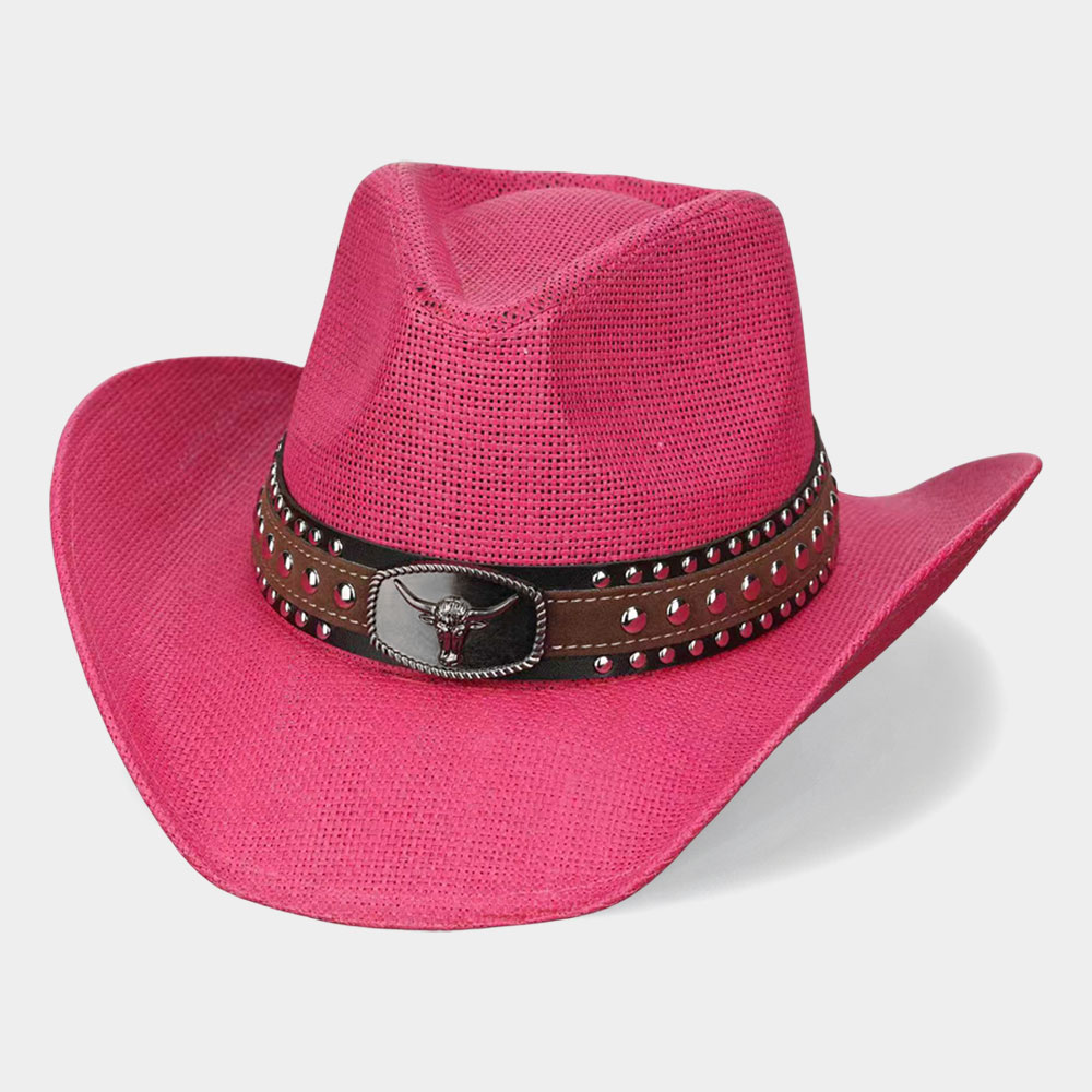 • Bold western-inspired cowboy hat featuring a structured silhouette and a stud-accented band with oval steer head buckle detail. Designed to elevate festival looks, themed collections, and statement outfits, this hat adds rugged character and standout style to any accessory assortment.
