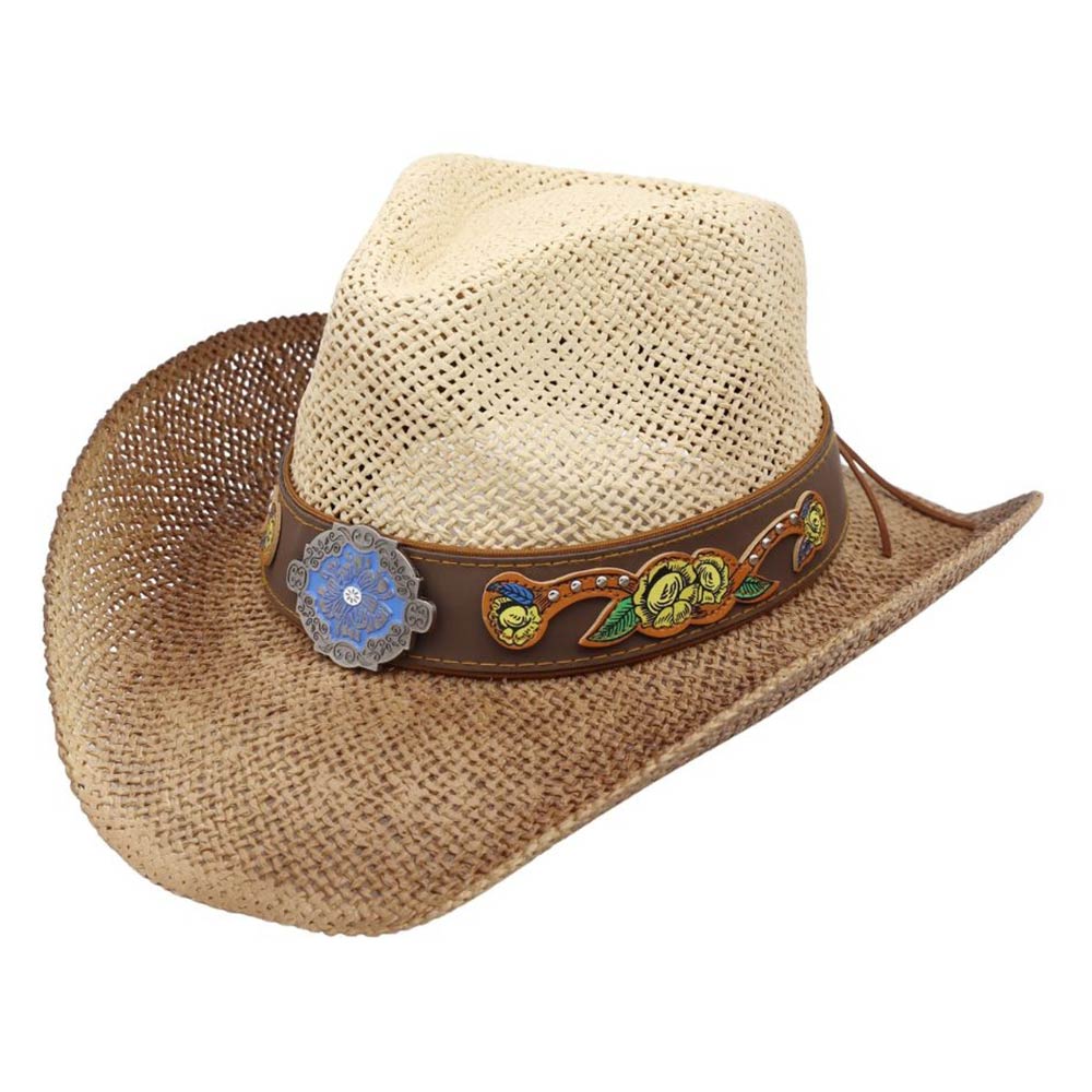 Boho Two Tone Rhinestone Studded Floral Concho Band Western Straw Cowboy Hat