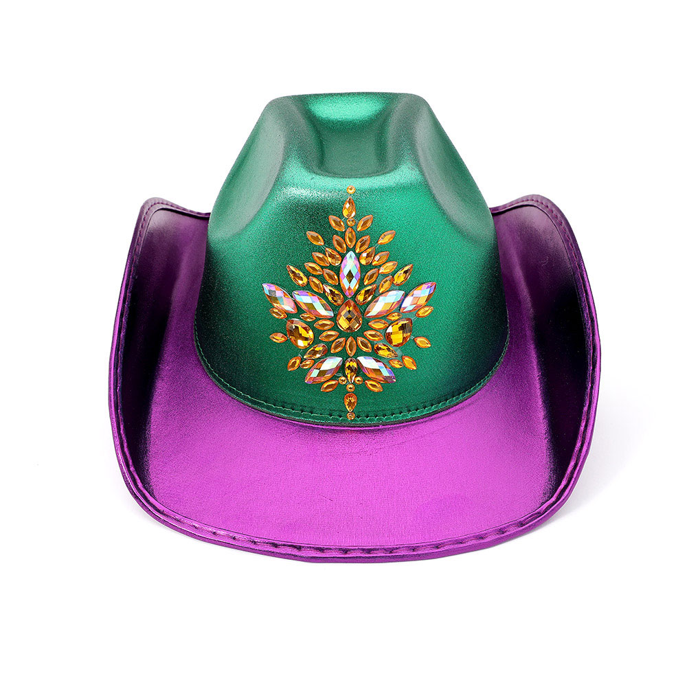 Details • Crown Circumference : 23" • Crown Height : 4" • Brim Height : 3" • Festive cowboy-style hat designed for parades, themed parties, and carnival celebrations. Features a decorative sequin design and structured western shape that elevates costumes, group outfits, photo ops, and event styling with bold, playful flair.