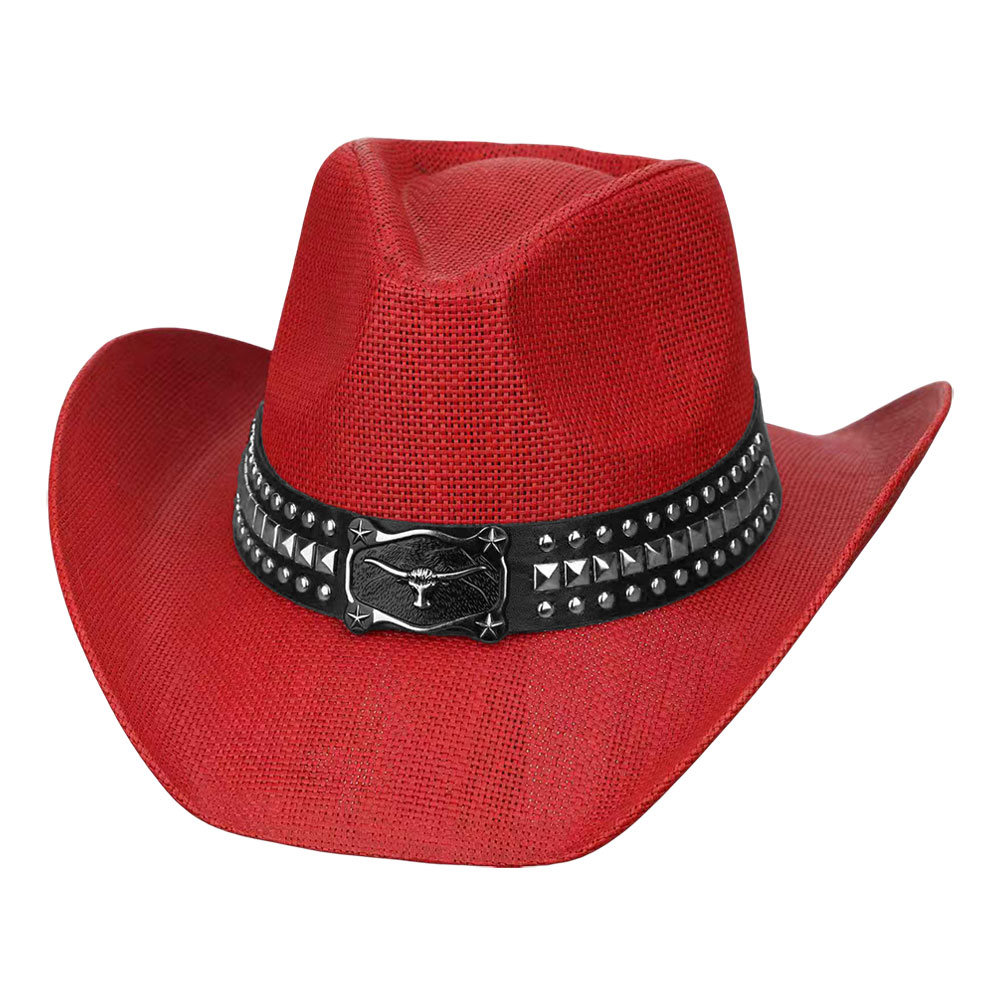 Metal Steer Head Buckle Studded Faux Leather Band Western Straw Cowboy Hat