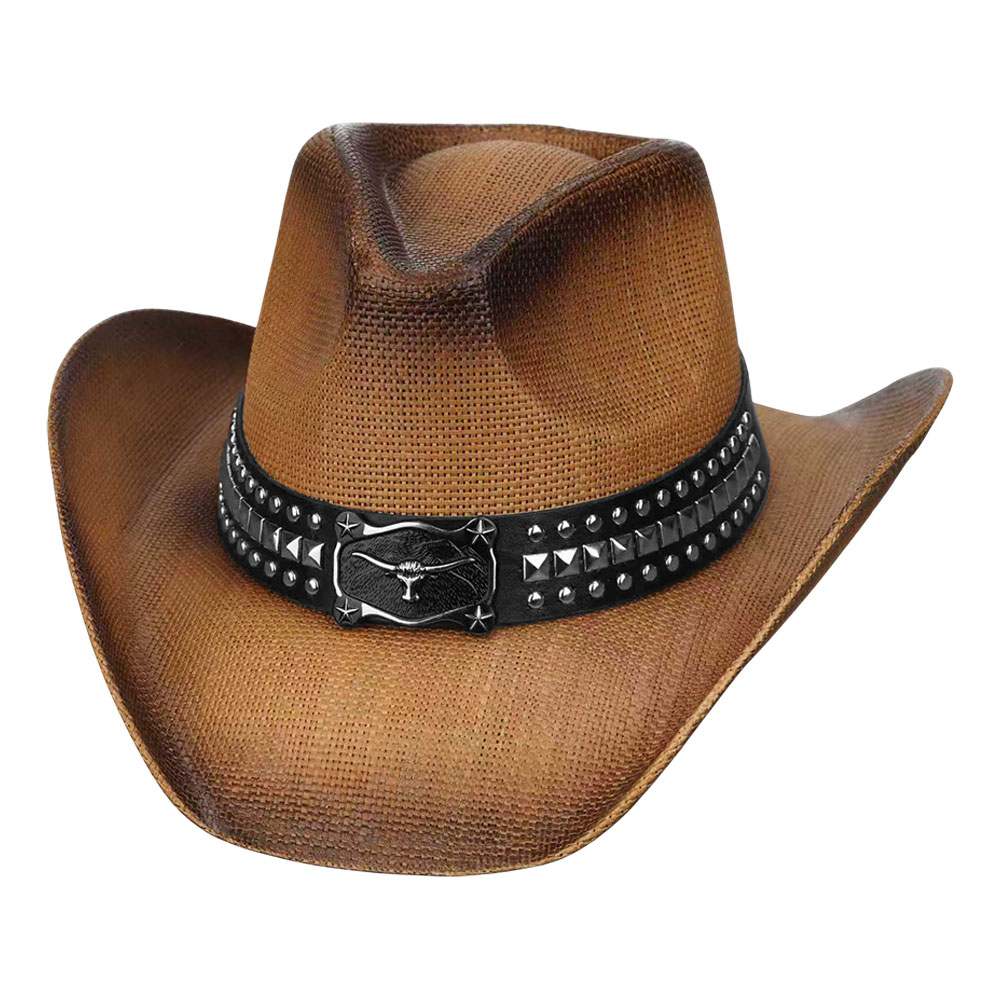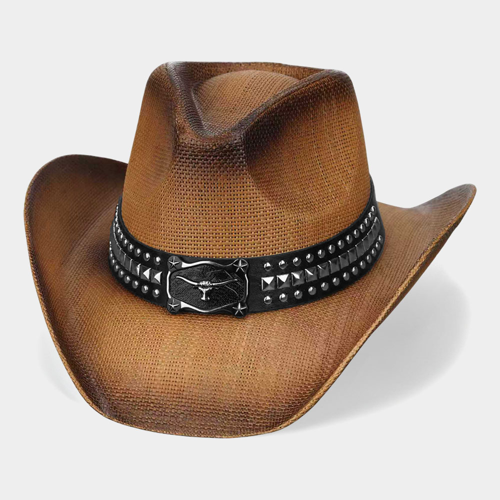 Metal Steer Head Buckle Studded Faux Leather Band Western Straw Cowboy Hat