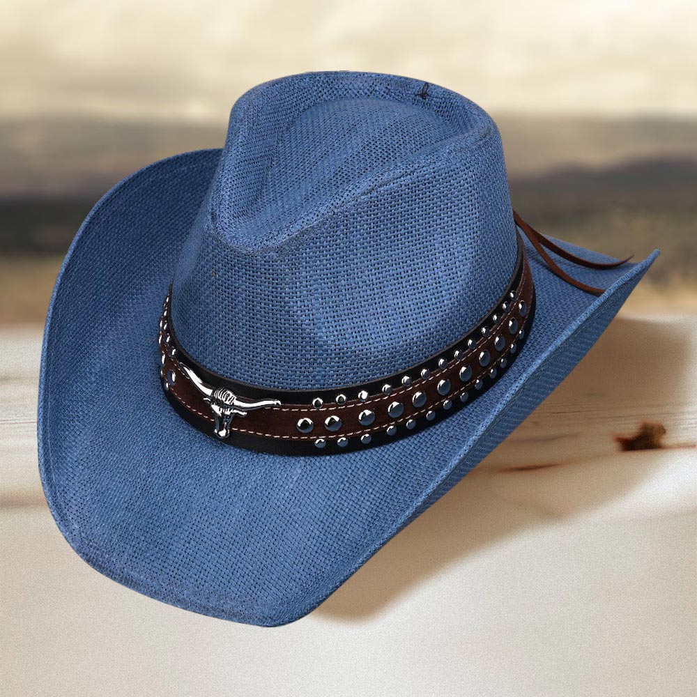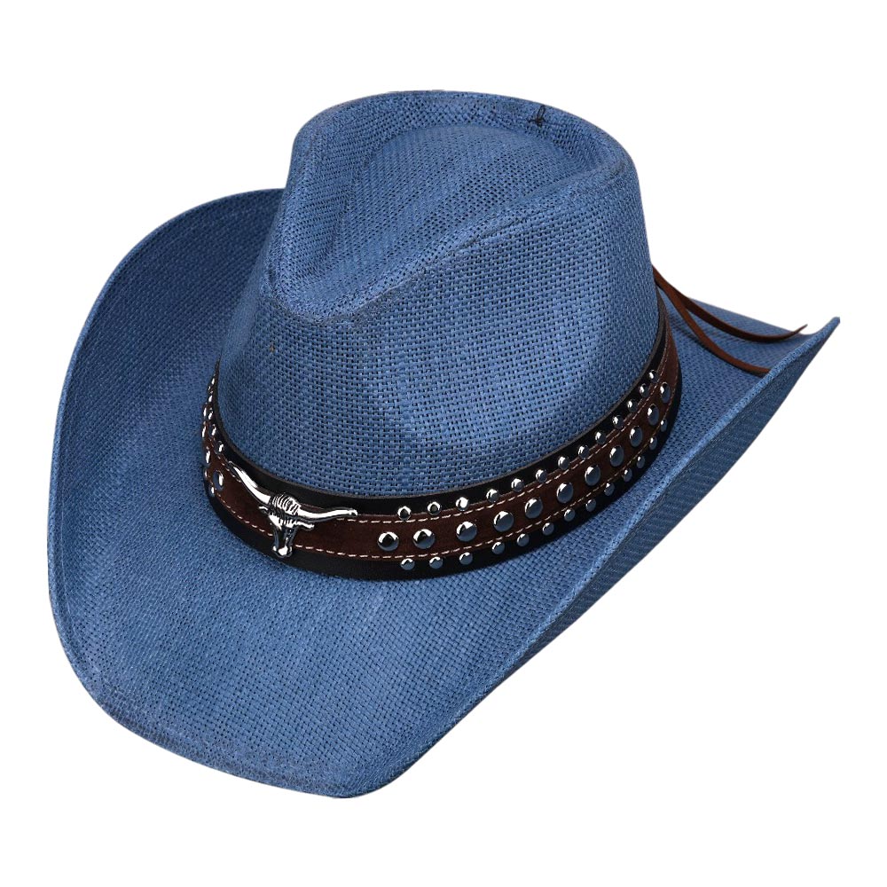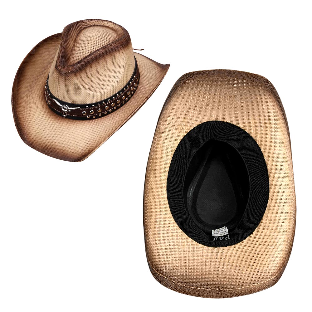 Metal Steer Head Studded Faux Leather Band Western Straw Cowboy Fedora Hat