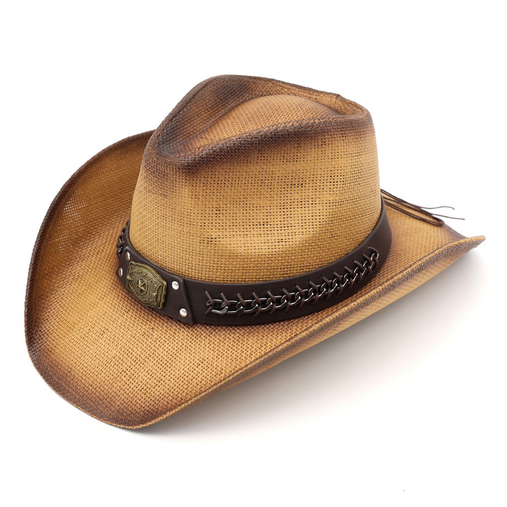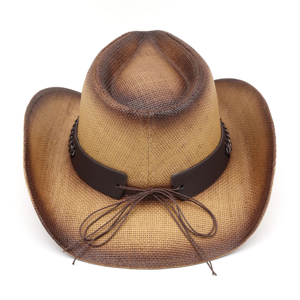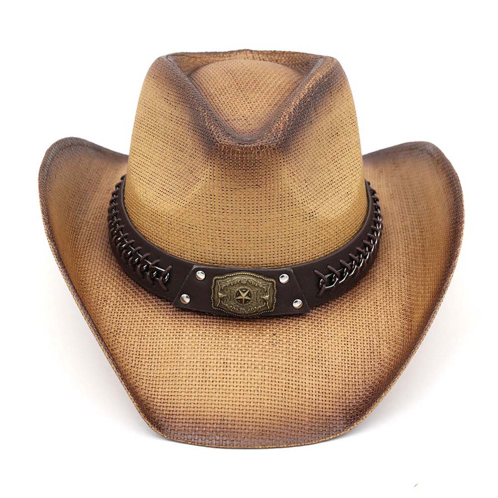 Metal Star Studded Faux Leather Band Western Straw Woven Cowboy Hat