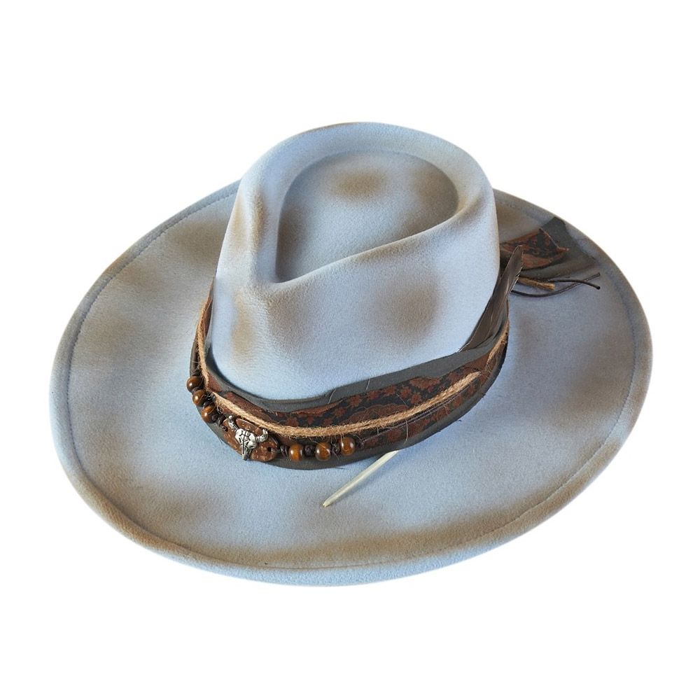 Steer Head Accent Feather Beaded Band Rustic Vintage Distressed Western Cowgirl Fedora Hat