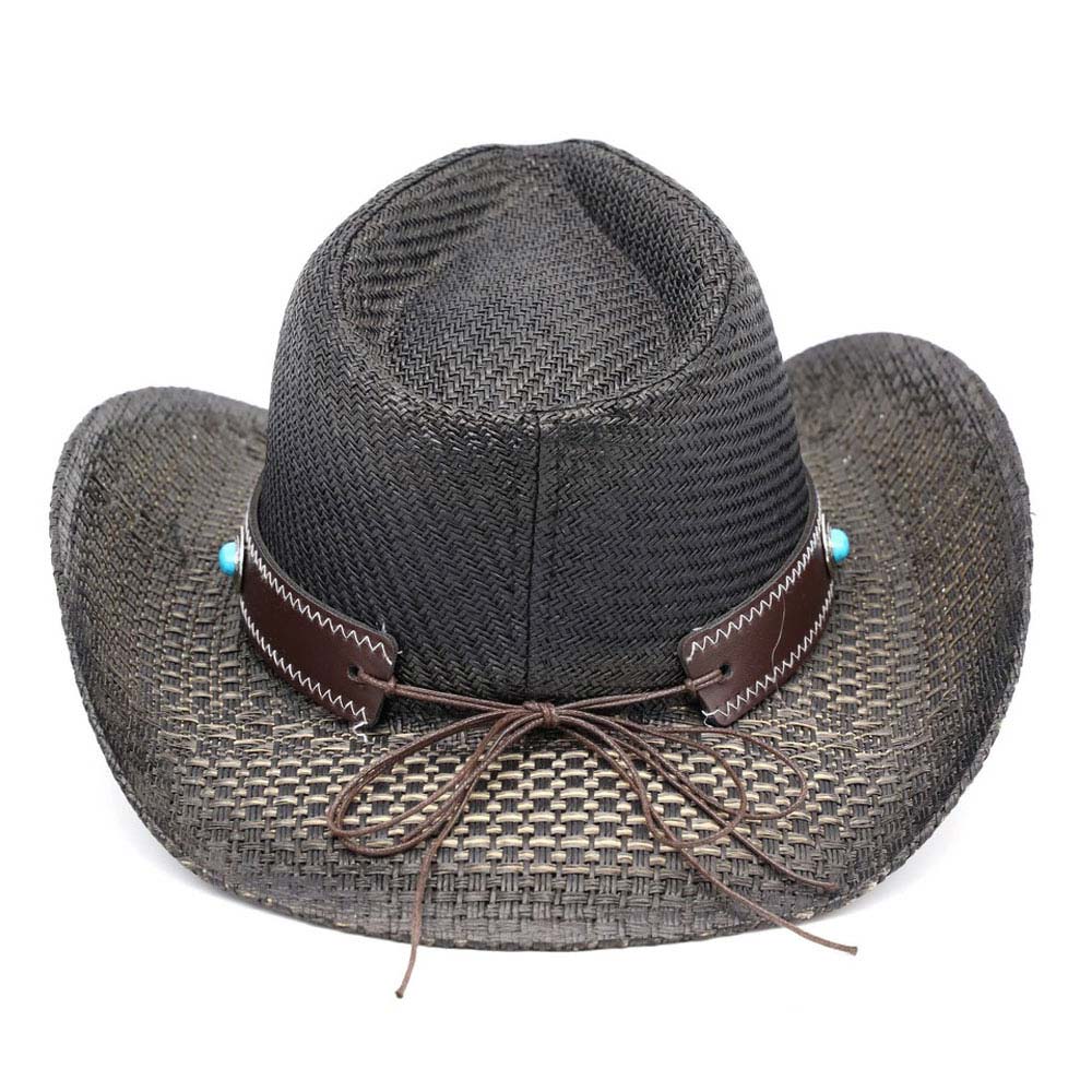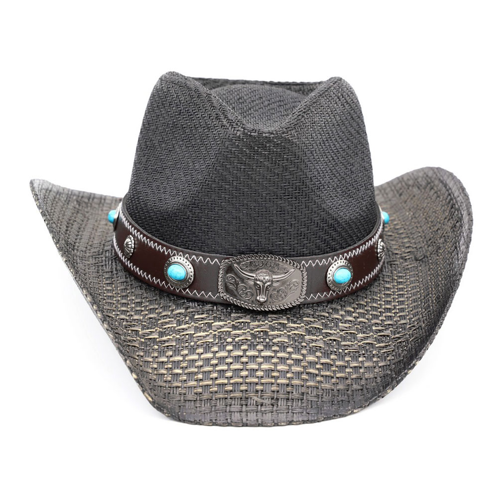 Steer Head Buckle Accent Turquoise Stone Concho Faux Leather Band Western Straw Cowboy Hat