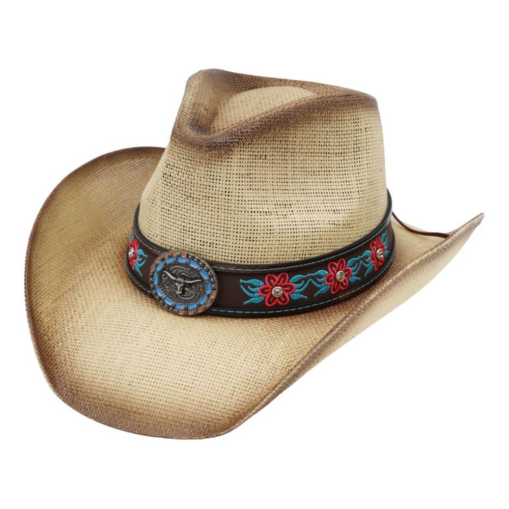 Steer Head Oval Concho Accent Floral Embroidered Band Western Straw Cowboy Hat