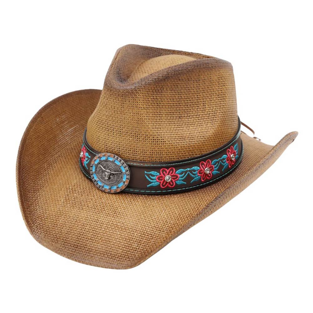 Steer Head Oval Concho Accent Floral Embroidered Band Western Straw Cowboy Hat Steer Head Oval Concho Accent Floral Embroidered Band Western Straw Cowboy Hat Steer Head Oval Concho Accent Floral Embroidered Band Western Straw Cowboy Hat