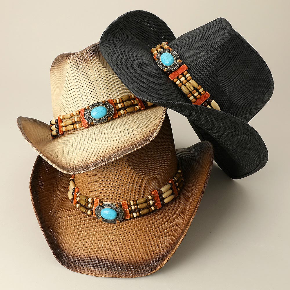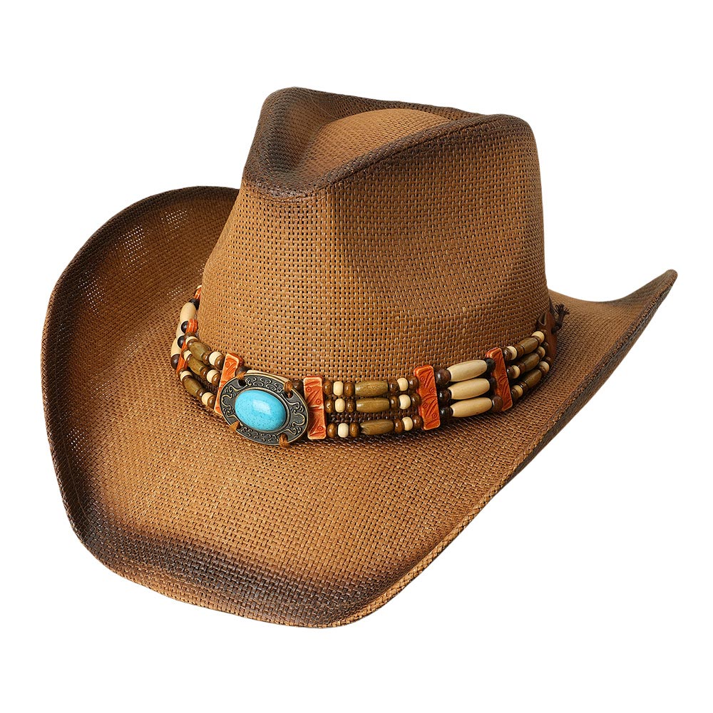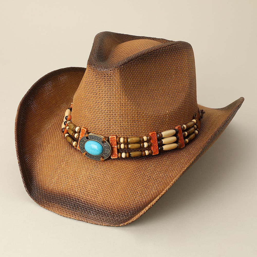 Turquoise Stone Pointed Wooden Beaded Band Western Straw Cowboy Fedora Hat