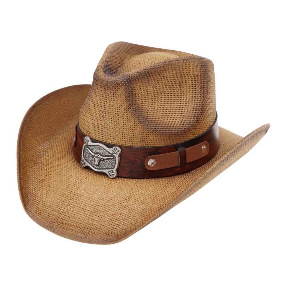 Vintage Longhorn Steer Head Buckle Accent Band Western Straw Cowboy Hat