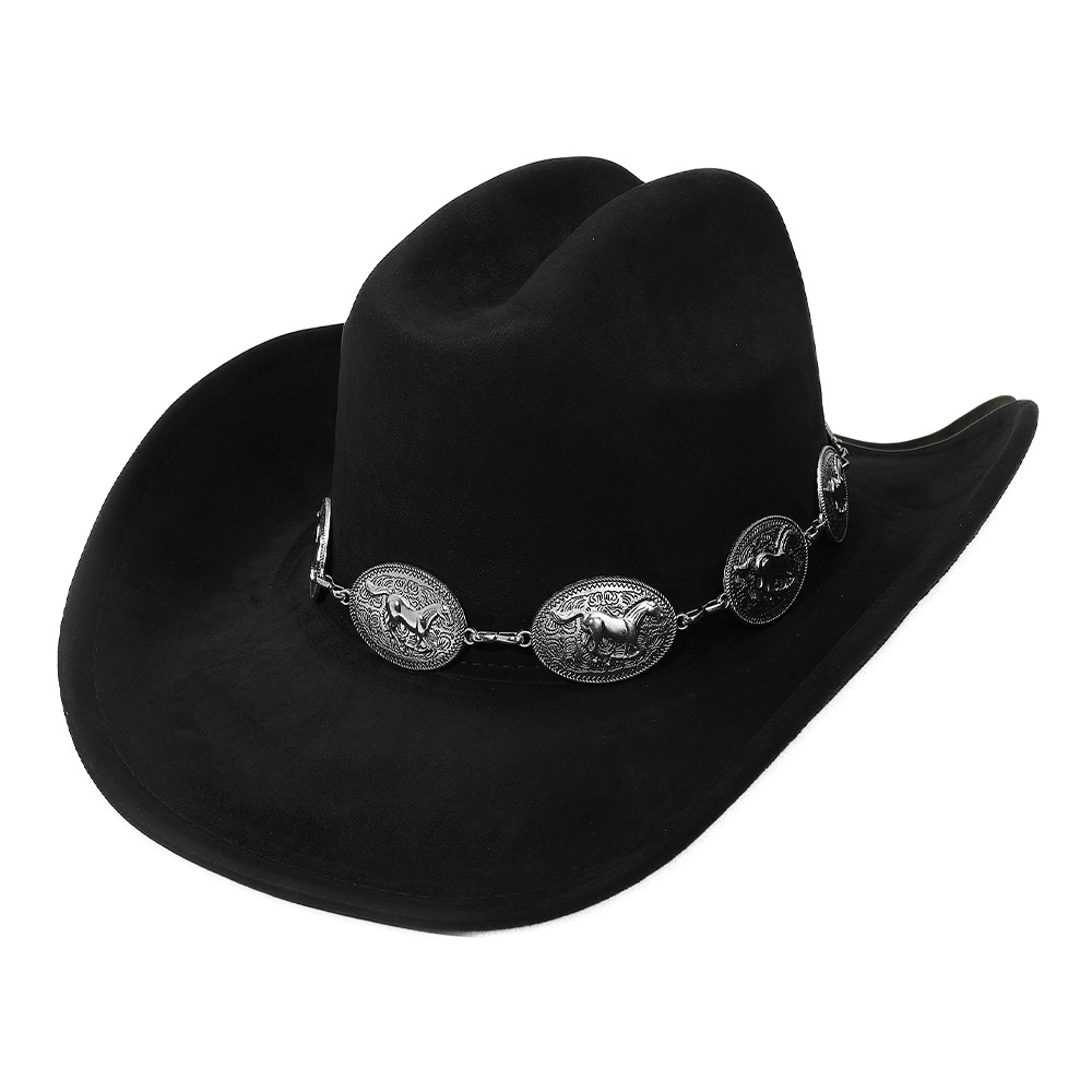 Details • Crown Circumference : 23" • Crown Height : 4.75" • Brim Height : 3.75" • Material : 100% Polyester • Classic cowboy hat featuring an oval concho chain band with engraved rodeo-inspired details. Designed for rodeos, concerts, festivals, or everyday western wear, this bold hat brings authentic cowboy style with a durable design and striking concho accents for standout western fashion.