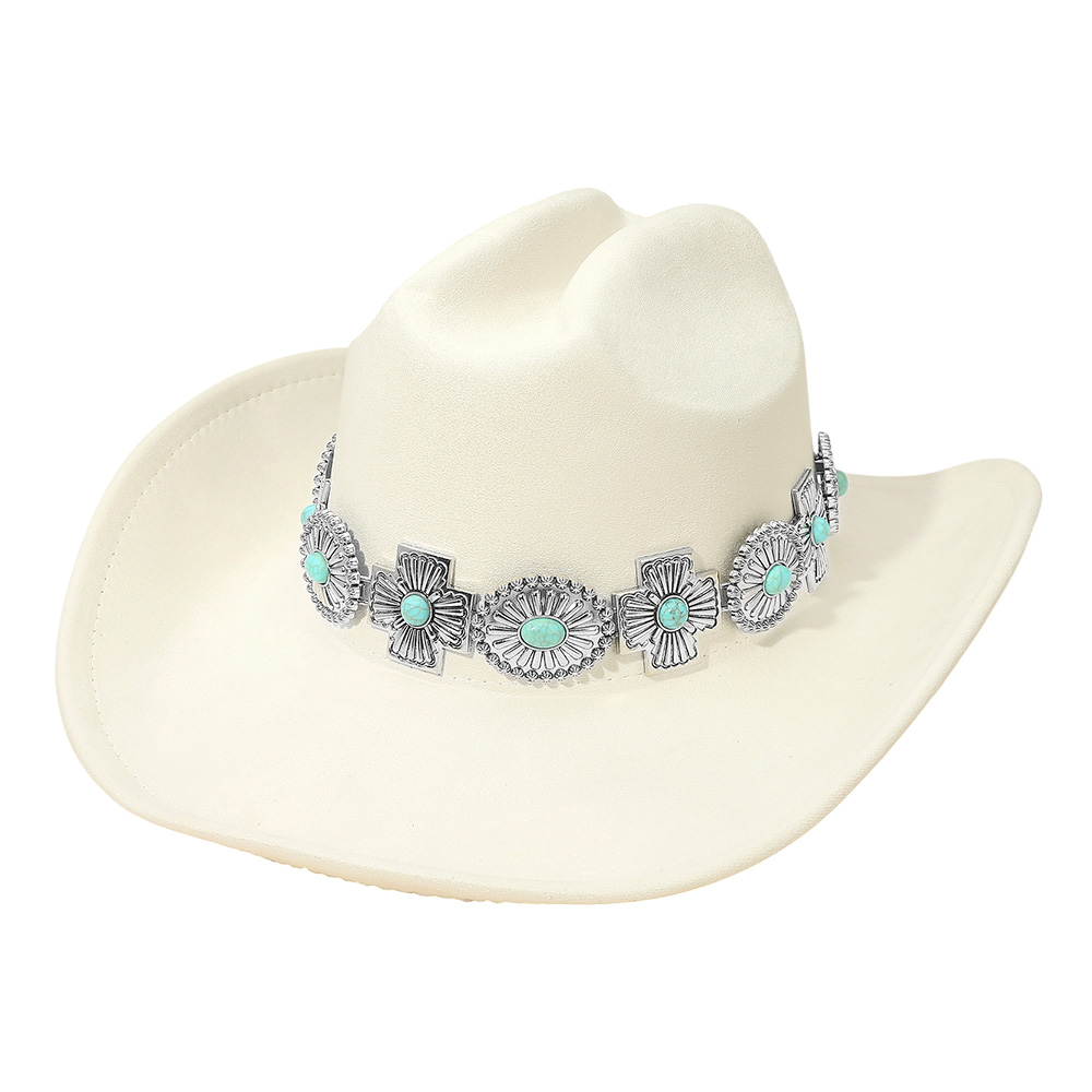 Details • Crown Circumference : 23" • Crown Height : 4.75" • Brim Height : 3.75" • Material : 100% Polyester • Classic western cowboy hat designed with a detailed concho band that adds bold character and unique flair. Perfect for festivals, rodeos, or casual style, this hat blends timeless tradition with standout fashion appeal, making it a versatile accessory for any western-inspired look.