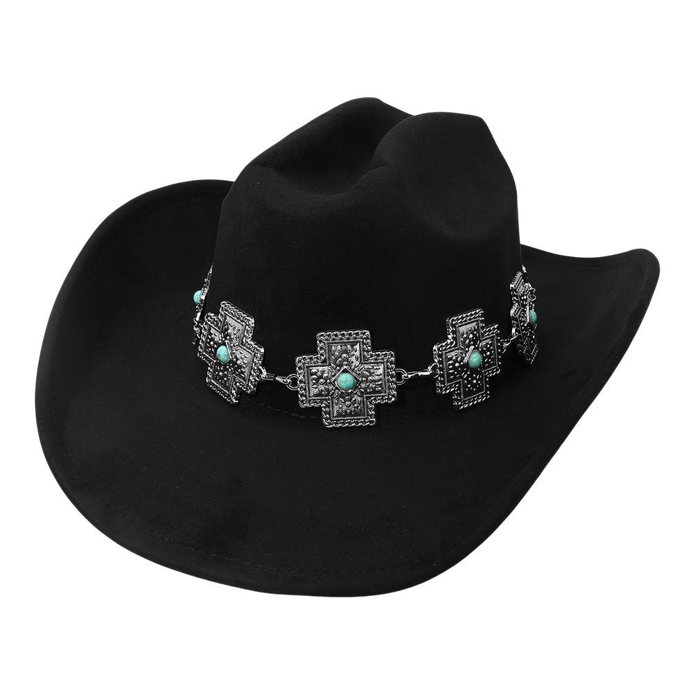 • Classic cowboy hat accented with a bold cross concho chain band featuring detailed engravings and turquoise-style accents. Perfect for rodeo events, concerts, festivals, and western wear, this hat blends traditional cowboy style with standout charm, making it a must-have western accessory.
