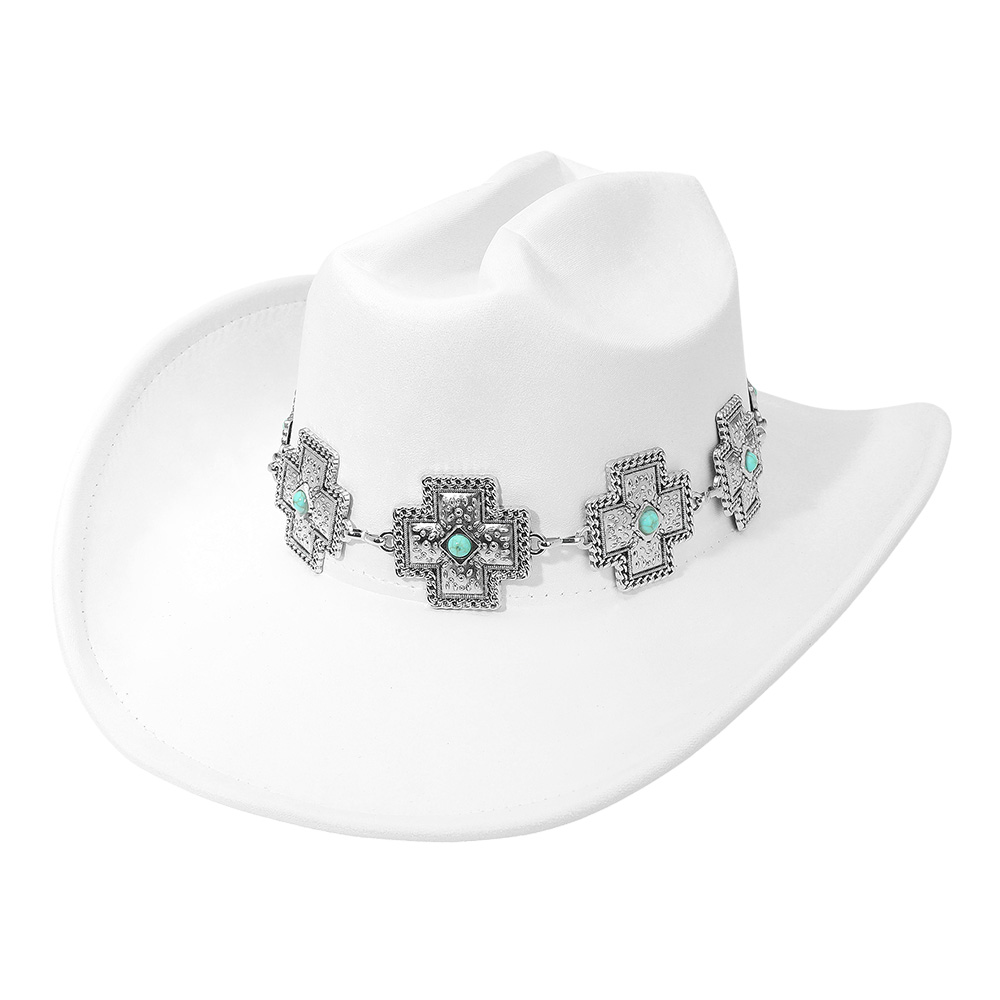 • Classic cowboy hat accented with a bold cross concho chain band featuring detailed engravings and turquoise-style accents. Perfect for rodeo events, concerts, festivals, and western wear, this hat blends traditional cowboy style with standout charm, making it a must-have western accessory.