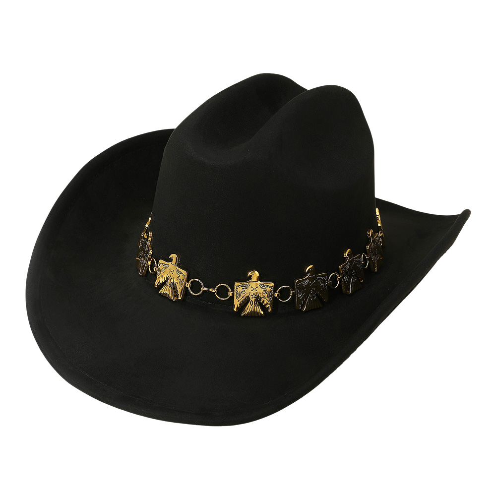 • Western cowboy hat detailed with a bold eagle concho chain band, blending rugged charm with symbolic style. Perfect for rodeos, festivals, concerts, and everyday western fashion, this statement hat offers durability and standout design for anyone who loves authentic cowboy flair.