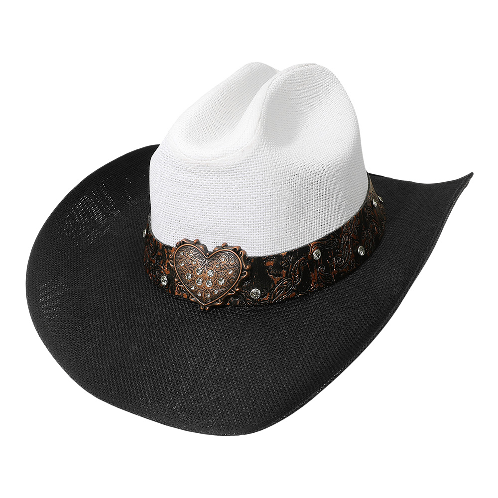 Details • Crown Circumference : 23" • Crown Height : 4.75" • Brim Height : 3.75" • Material : 98% Rayon, 2% Polyester • Show off bold western charm with this cowboy hat featuring an ornate heart concho and decorated band with shimmering accents. Perfect for concerts, festivals, or everyday wear, it delivers a unique statement piece that blends tradition with modern flair.