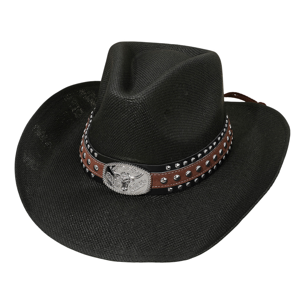 • Command attention with this cowboy hat featuring a studded band and bold steer head concho centerpiece. Perfect for rodeos, concerts, or casual wear, it captures rugged western spirit with striking detail, making it a must-have accessory for adventurous style.