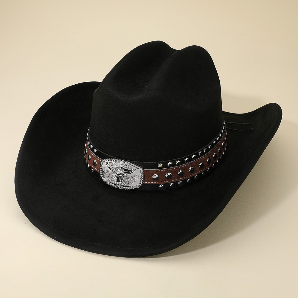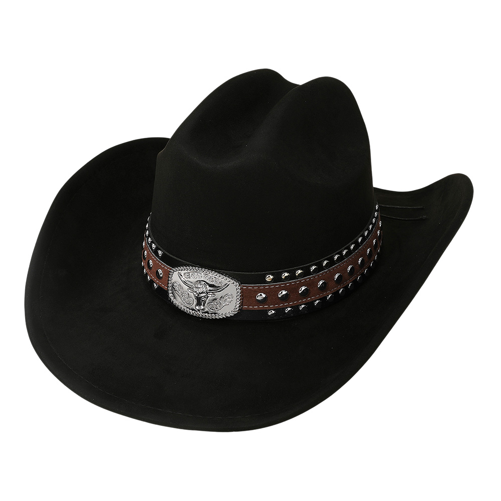 • Western cowboy hat accented with a bold steer head buckle band, featuring studded details for a rugged finish. Perfect for rodeos, concerts, festivals, and everyday wear, this hat combines durability with authentic cowboy style, making it a standout piece in western fashion collections.
