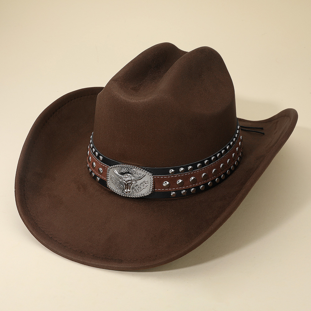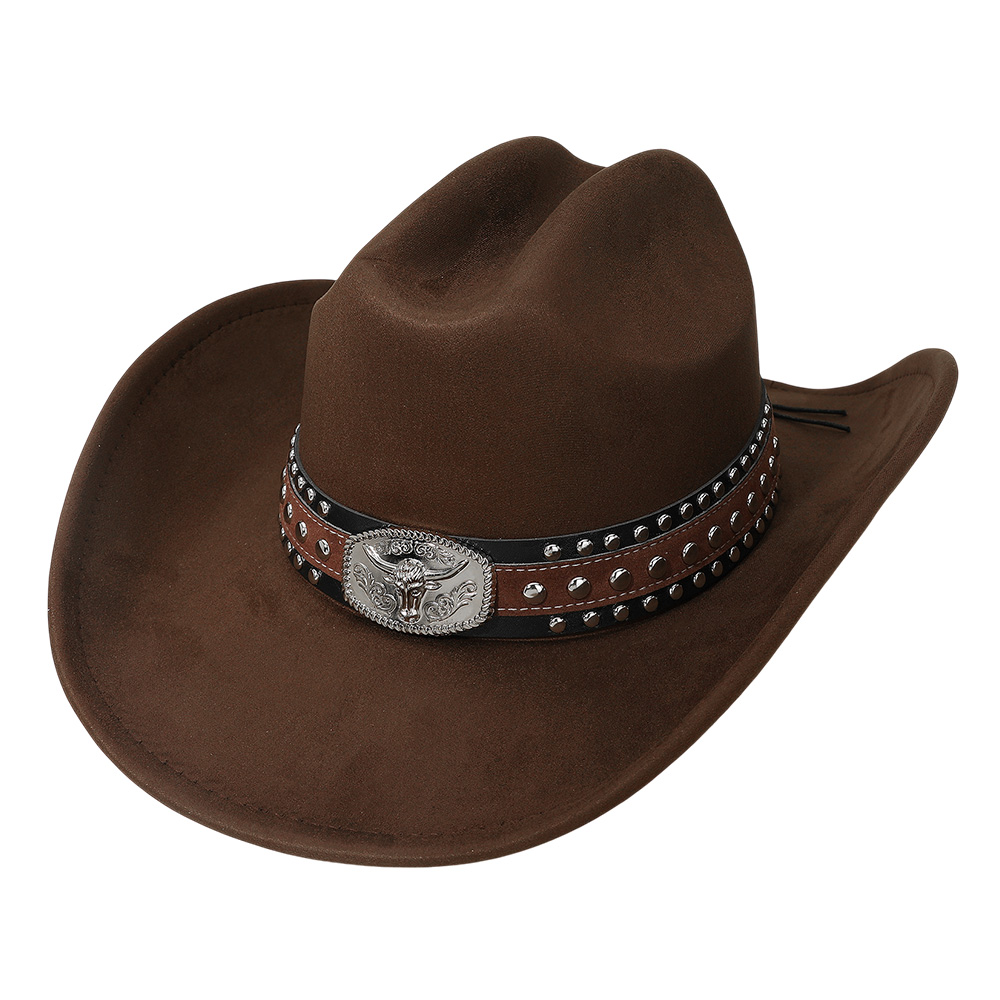Details • Crown Circumference : 23" • Crown Height : 4.75" • Brim Height : 3.75" • Material : 100% Polyester • Western cowboy hat accented with a bold steer head buckle band, featuring studded details for a rugged finish. Perfect for rodeos, concerts, festivals, and everyday wear, this hat combines durability with authentic cowboy style, making it a standout piece in western fashion collections.