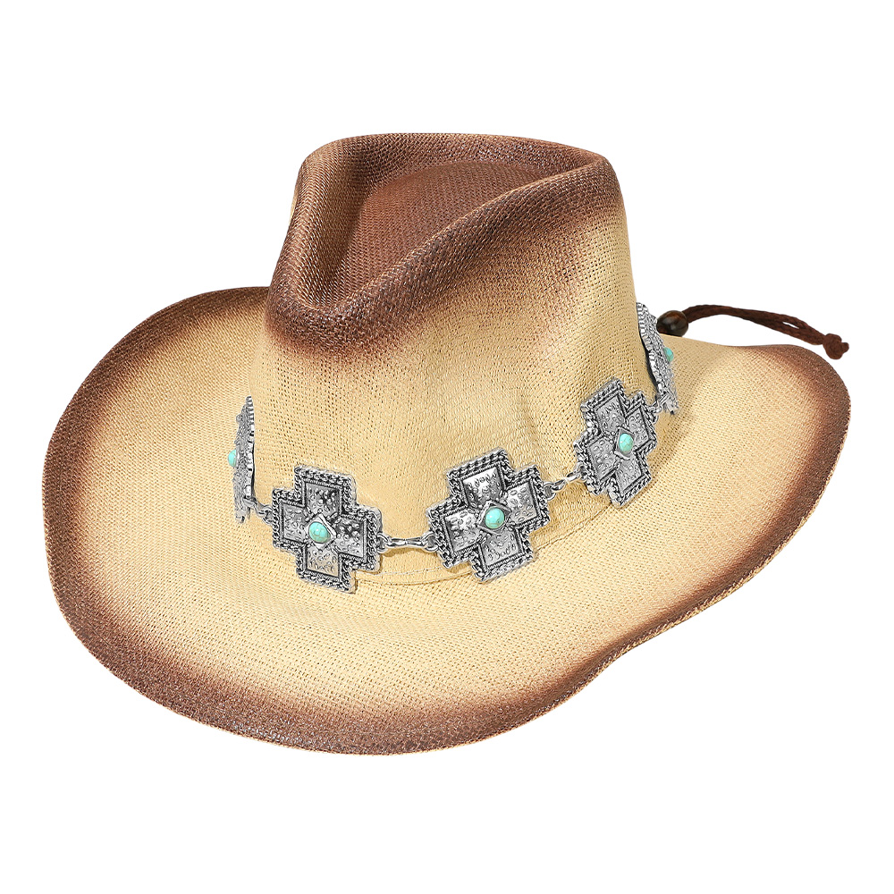 Details • Crown Circumference : 23" • Crown Height : 4.75" • Brim Height : 3.75" • Material : 98% Rayon, 2% Polyester • Stand out in authentic western style with this cowboy hat featuring a striking cross concho band accented with turquoise details. Perfect for rodeos, festivals, or everyday wear, it blends rugged tradition with bold design for a distinctive statement piece.
