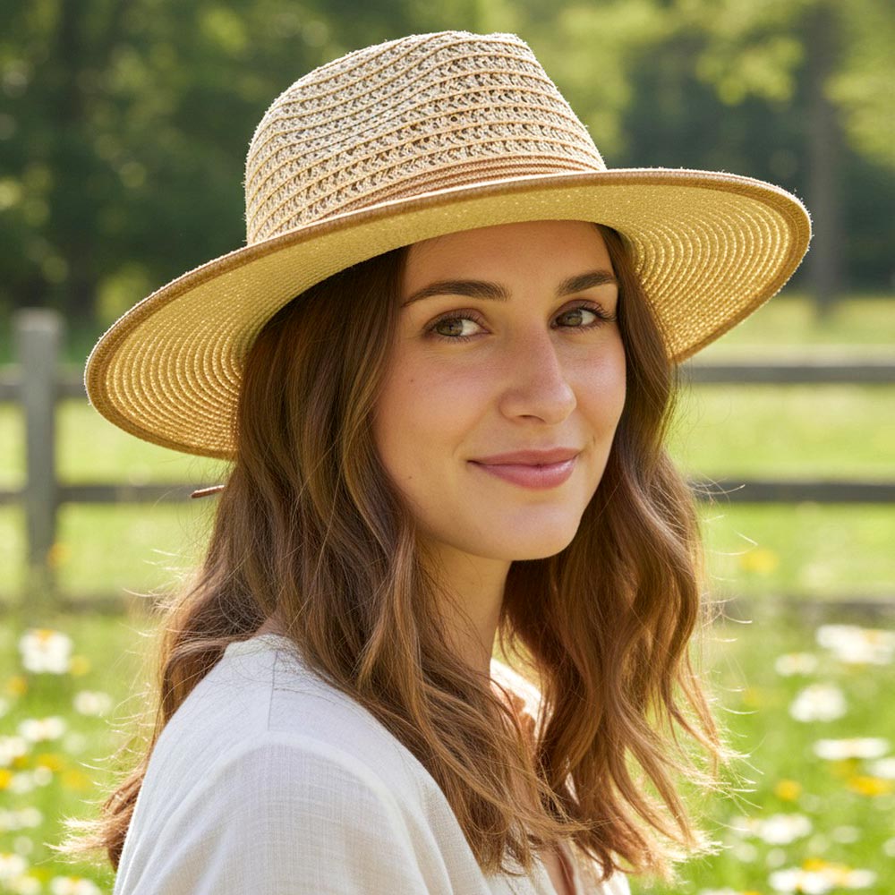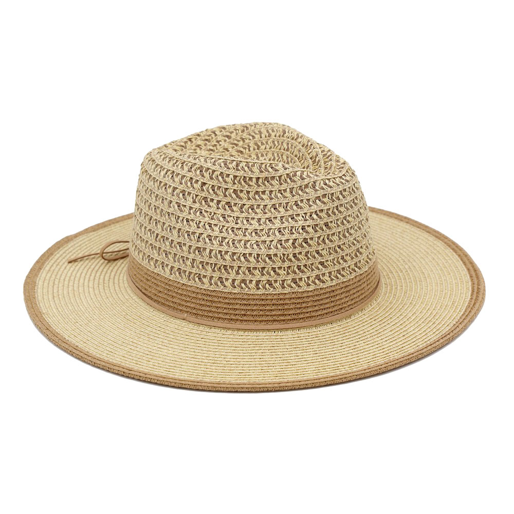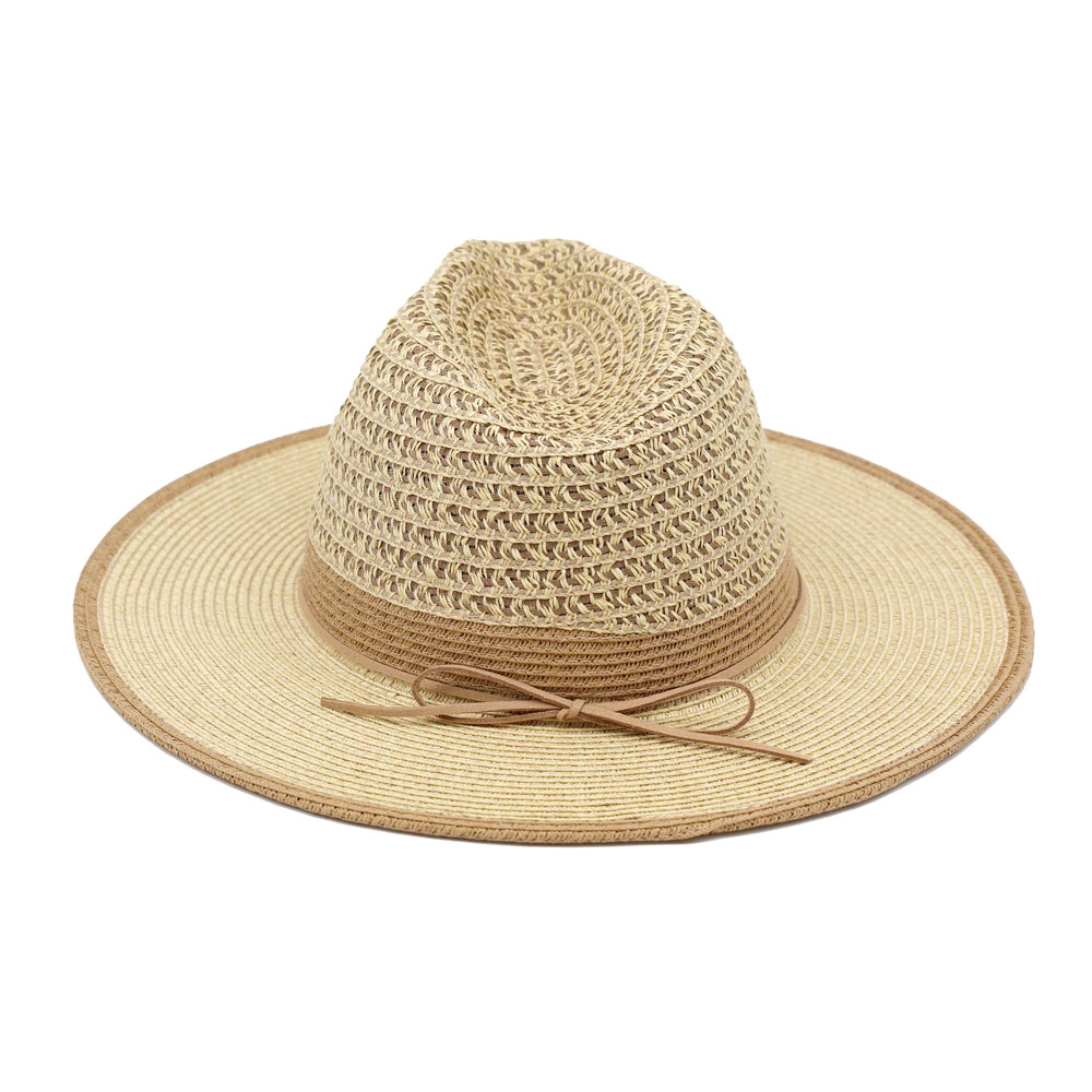 Details • Size : One Size • Material : 80% Paper, 20% Polyester • This wide brim sun hat features a textured woven crown with a subtle tied accent for a refined, effortless look. Designed for everyday wear, vacations, and warm-weather styling, it pairs easily with casual outfits and resort looks. A versatile accessory ideal for boutique assortments, seasonal collections, and trend-focused merchandising displays.