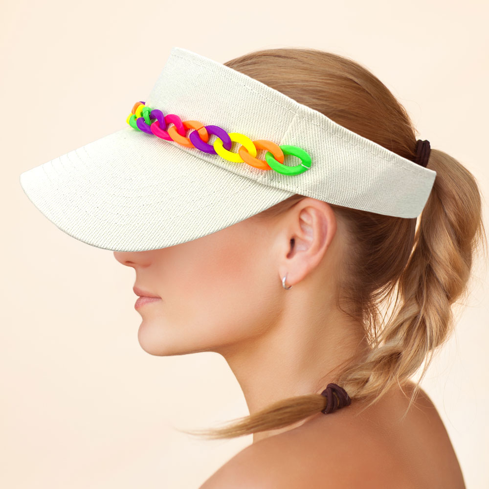• Stylish wide brim visor cap featuring a bold chain accent. Perfect for sunny days, this adjustable visor offers both fashion and function for outdoor events, sports, or beach outings.