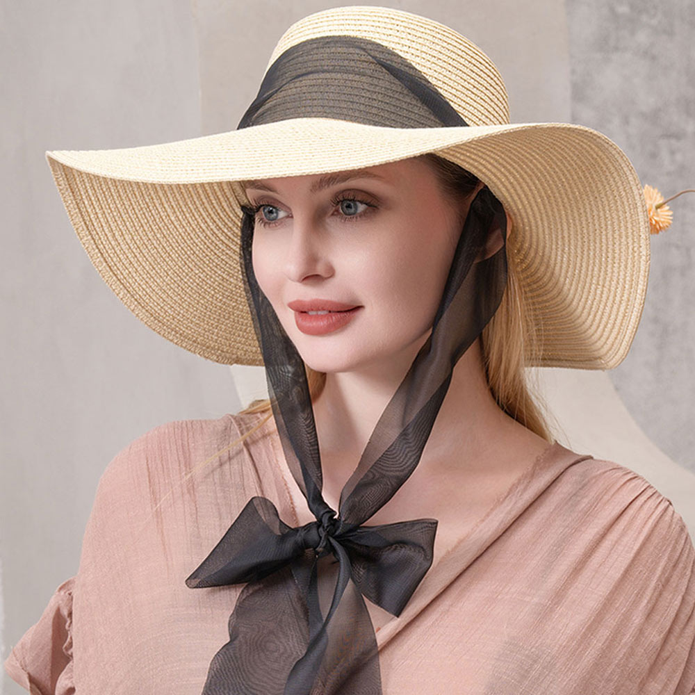 Mesh Ribbon Floppy Straw Sun Hat