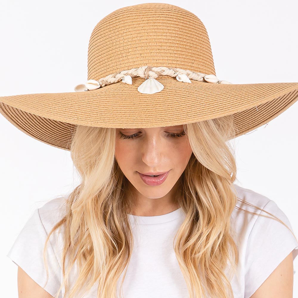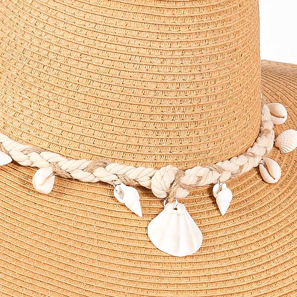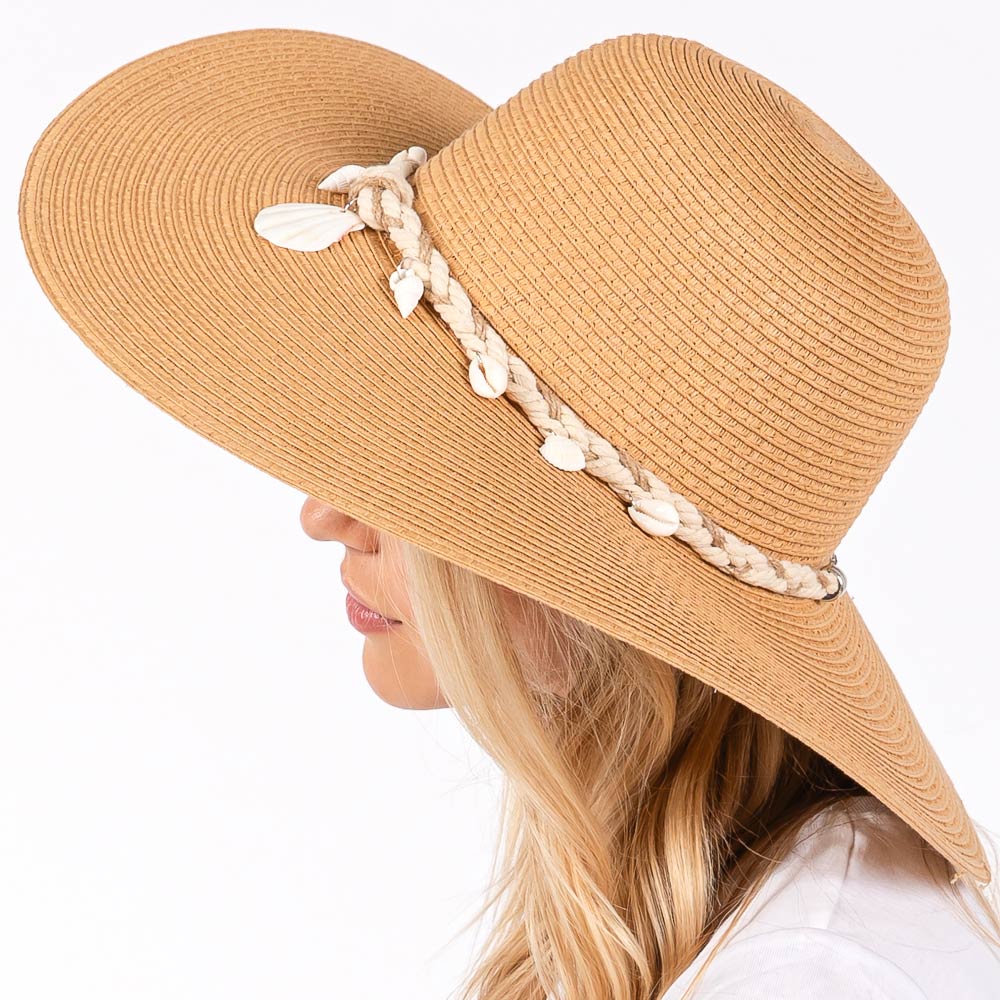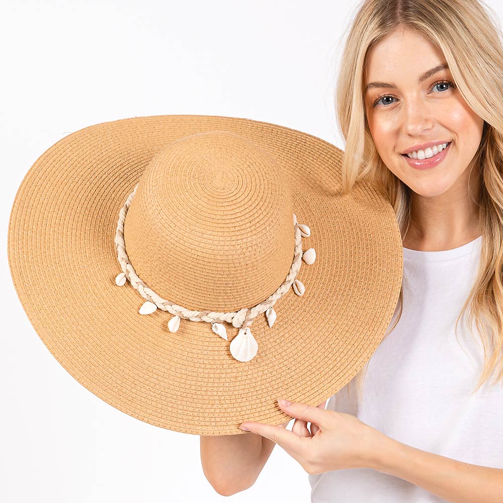 Wide Brim Straw Sun Hat with Shell and Conch Braided Band