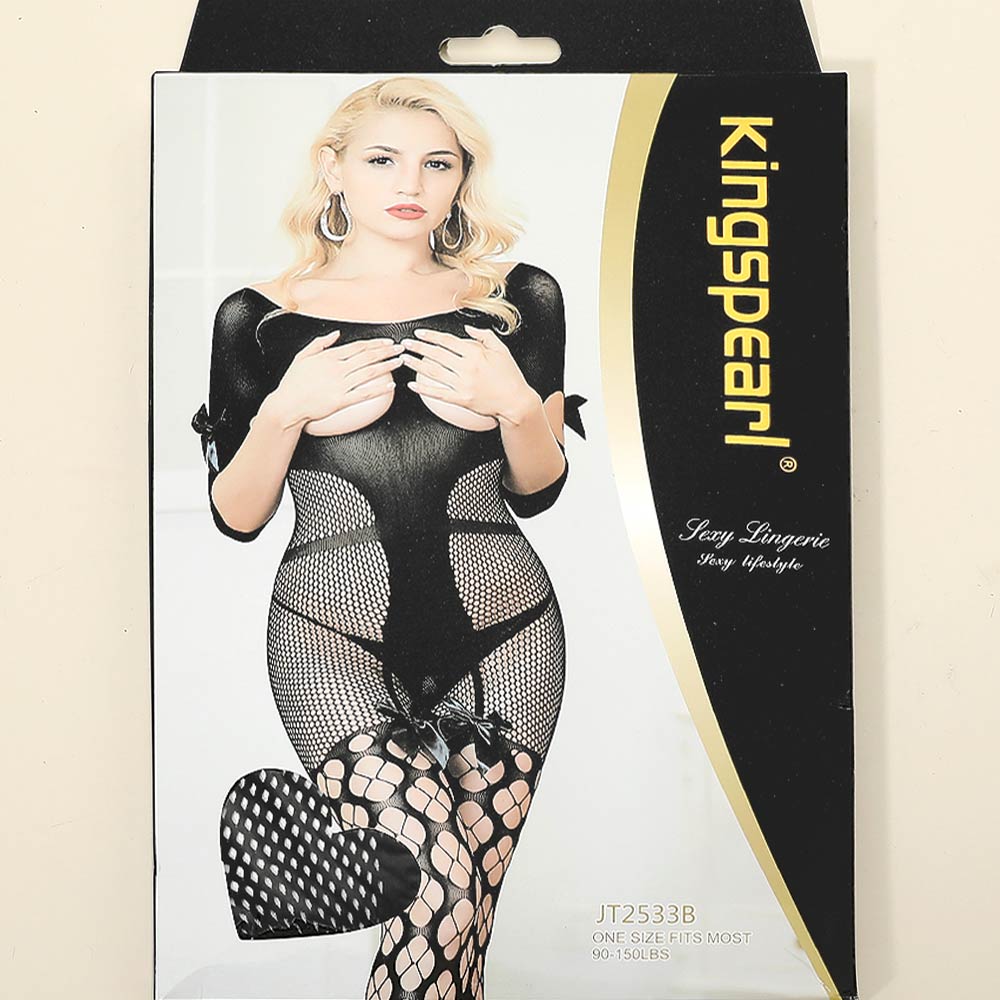 Details • Size : One Size • Material : 90% Nylon, 10% Spandex • Thong NOT Included • Hand Wash Warm • Do Not Bleach • Hang Dry • This one-piece fishnet bodystocking features an eye-catching cutout design that enhances natural curves with a sleek, body-hugging fit. Designed in a flexible one-size style, it’s ideal for bold lingerie looks, intimate moments, or boutique and online retail collections.