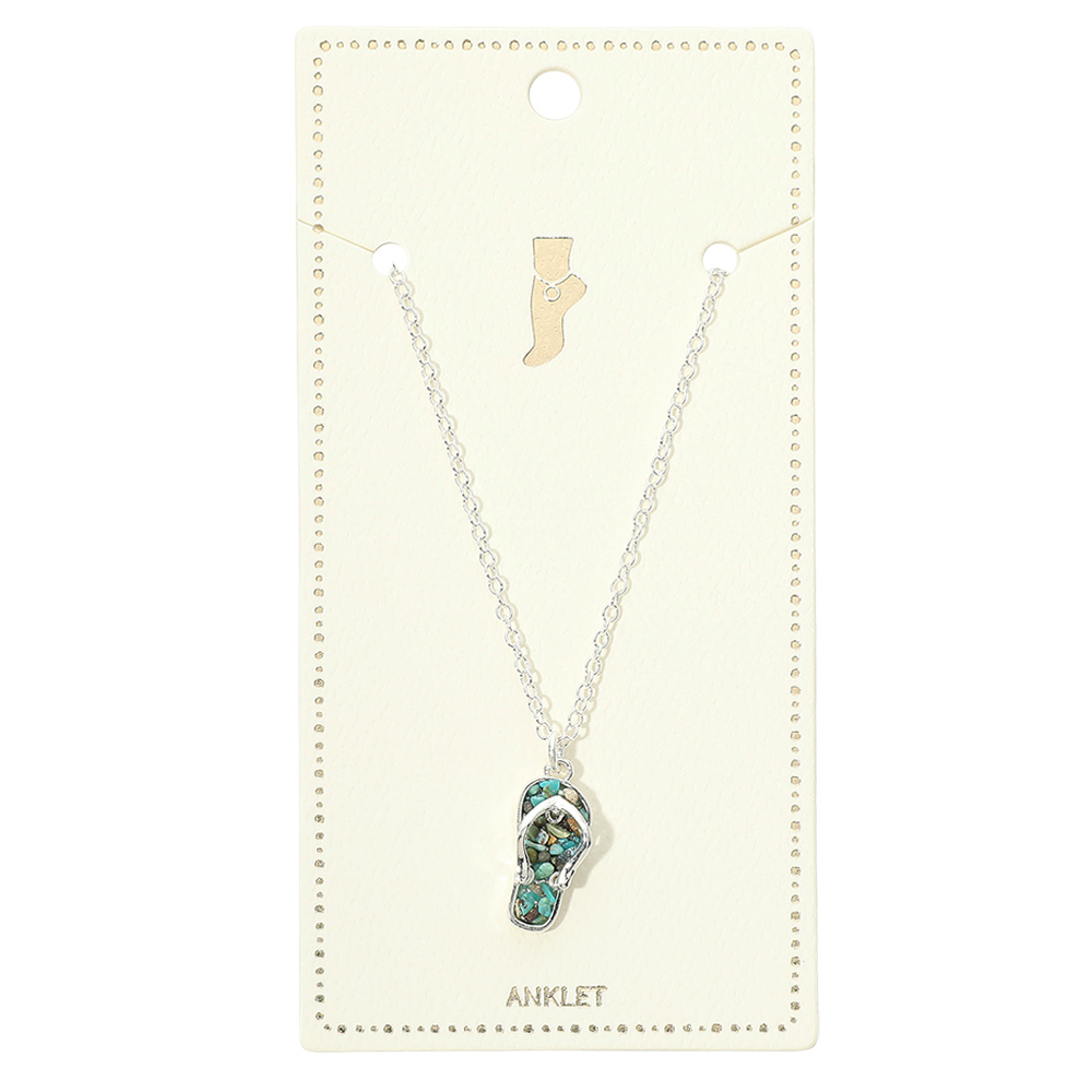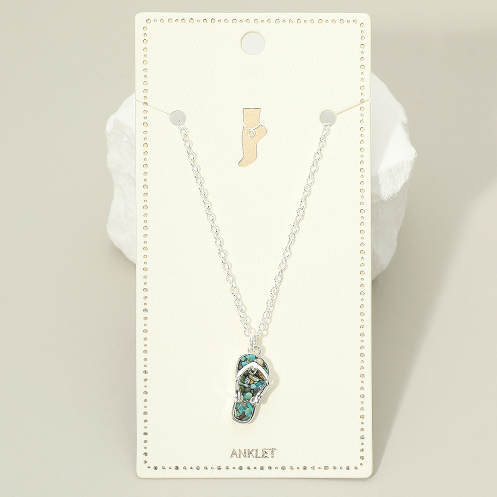 Details • Size : 9" + 1.5" L • Charm Size : 0.4" X 1" • Lobster Clasp Closure • Crushed pebble flip flop charm anklet featuring a playful summer-inspired pendant that brings relaxed beach vibes to ankle styling. Lightweight and comfortable for everyday wear, this anklet is perfect for warm-weather outfits, vacations, resort looks, and boutique collections focused on casual, coastal, and seasonal fashion jewelry. • Lead and Nickel Compliant