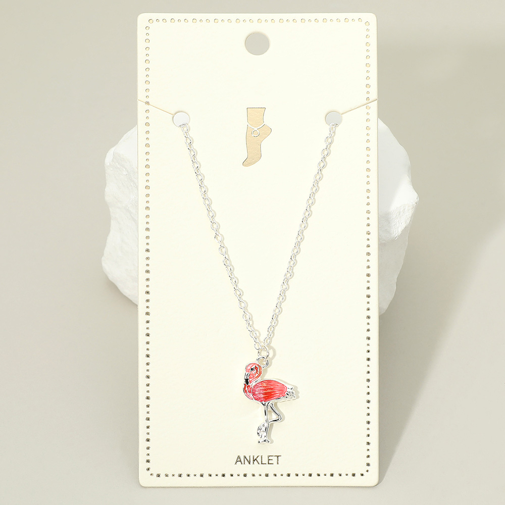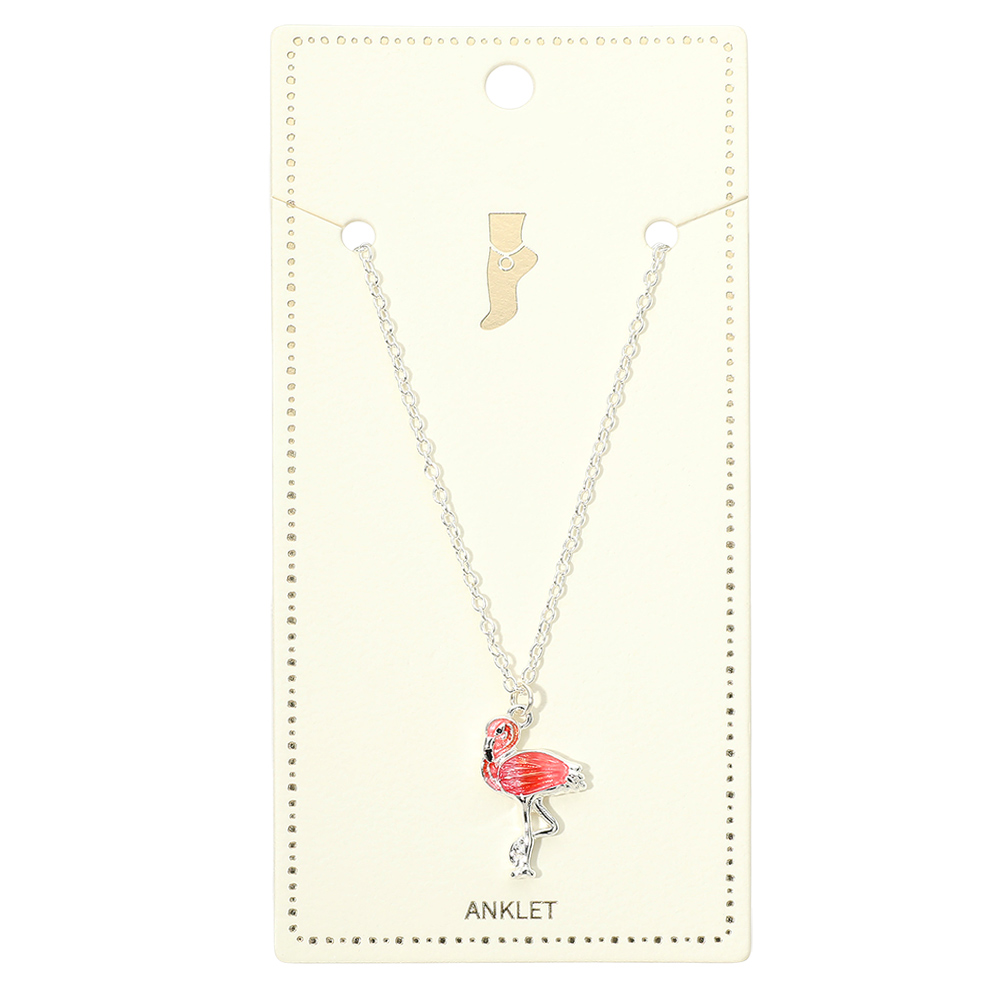 Details • Size : 9" + 1.5" L • Charm Size : 0.5" X 1" • Lobster Clasp Closure • Flamingo charm anklet featuring a playful tropical bird silhouette that brings a fun, vacation-ready accent to ankle styling. Ideal for summer collections, beach shops, resort wear, and giftable displays, this anklet appeals to customers seeking cheerful, lightweight fashion jewelry with a relaxed coastal and tropical vibe. • Lead and Nickel Compliant