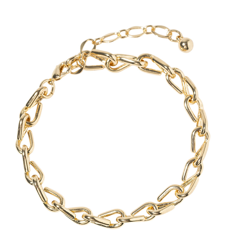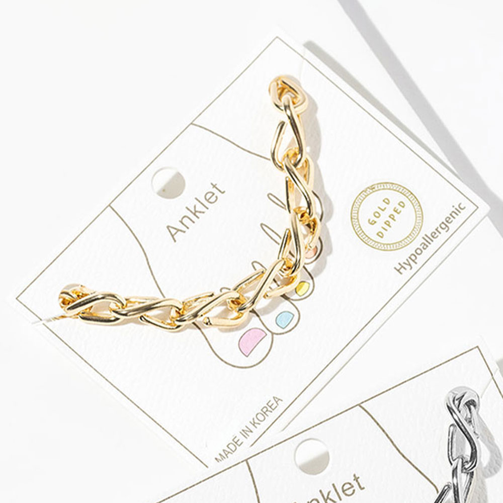 Details • Size : 0.3" H, 8.5" + 2.5" L • Lobster Clasp Closure • Modern twisted link anklet designed for effortless everyday styling. This sleek ankle bracelet features fluid interlocking links that create subtle movement and shine with every step. Perfect for casual wear, vacations, and layering with other ankle jewelry, offering a clean, trend-forward look that complements sandals, sneakers, or heels. • Gold Dipped • Made In Korea