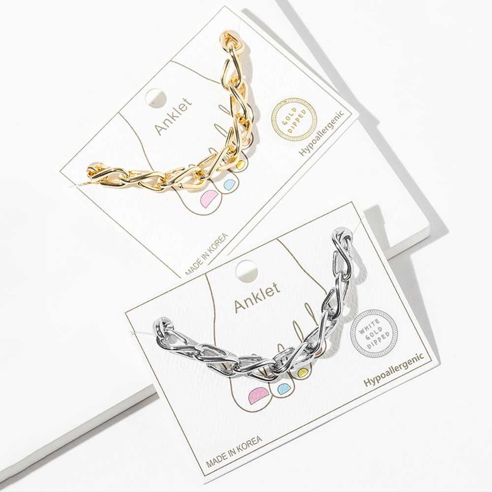 Details • Size : 0.3" H, 8.5" + 2.5" L • Lobster Clasp Closure • Modern twisted link anklet designed for effortless everyday styling. This sleek ankle bracelet features fluid interlocking links that create subtle movement and shine with every step. Perfect for casual wear, vacations, and layering with other ankle jewelry, offering a clean, trend-forward look that complements sandals, sneakers, or heels. • Gold Dipped • Made In Korea