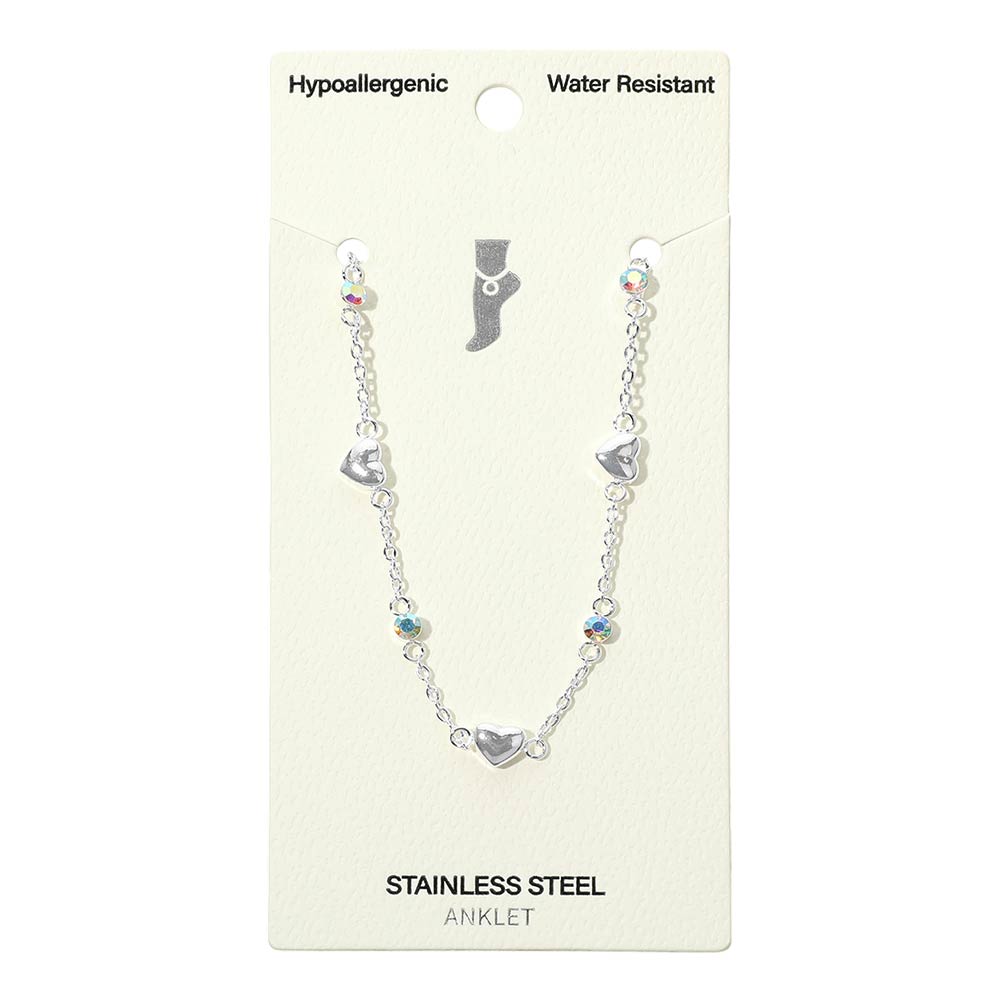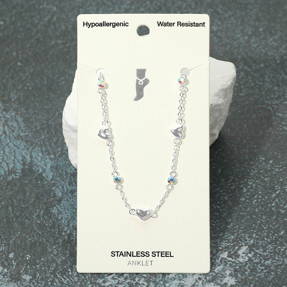 Details • Size : 0.25" H, 9.25" + 1.5" L • Lobster Clasp Closure • Water Resistant • Delicate chain anklet featuring heart-shaped charms and subtle crystal accents for a graceful, feminine look. Designed for comfortable daily wear, this anklet offers a polished finish that complements casual outfits, beachwear, or layered jewelry styling for a soft, romantic touch. • Hypoallergenic • Stainless Steel