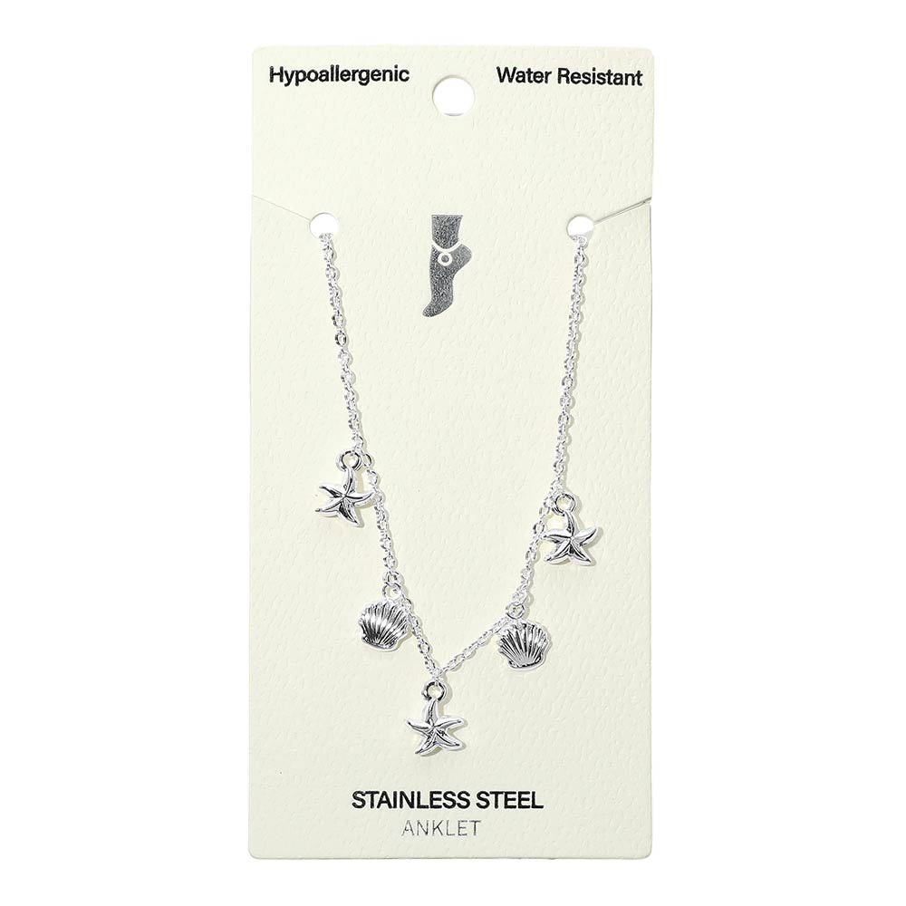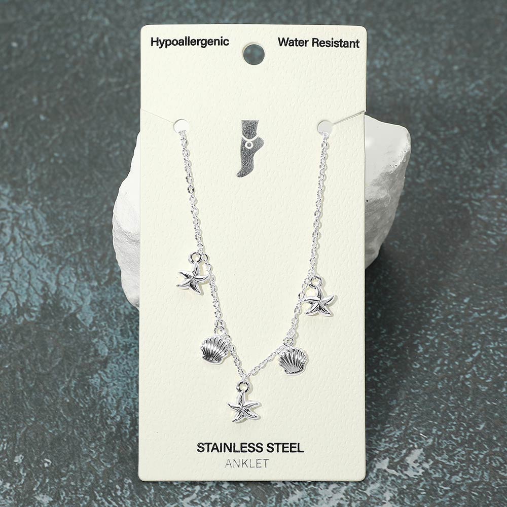 Details • Size : 9" + 1.5" L • Charm Size : 0.5" L • Lobster Clasp Closure • Water Resistant • Delicate anklet featuring starfish and shell charms spaced along a fine chain for a balanced, ocean-inspired look. Designed for comfortable daily wear, this anklet adds a subtle coastal accent to casual outfits, vacation styling, and layered jewelry combinations. • Hypoallergenic • Stainless Steel