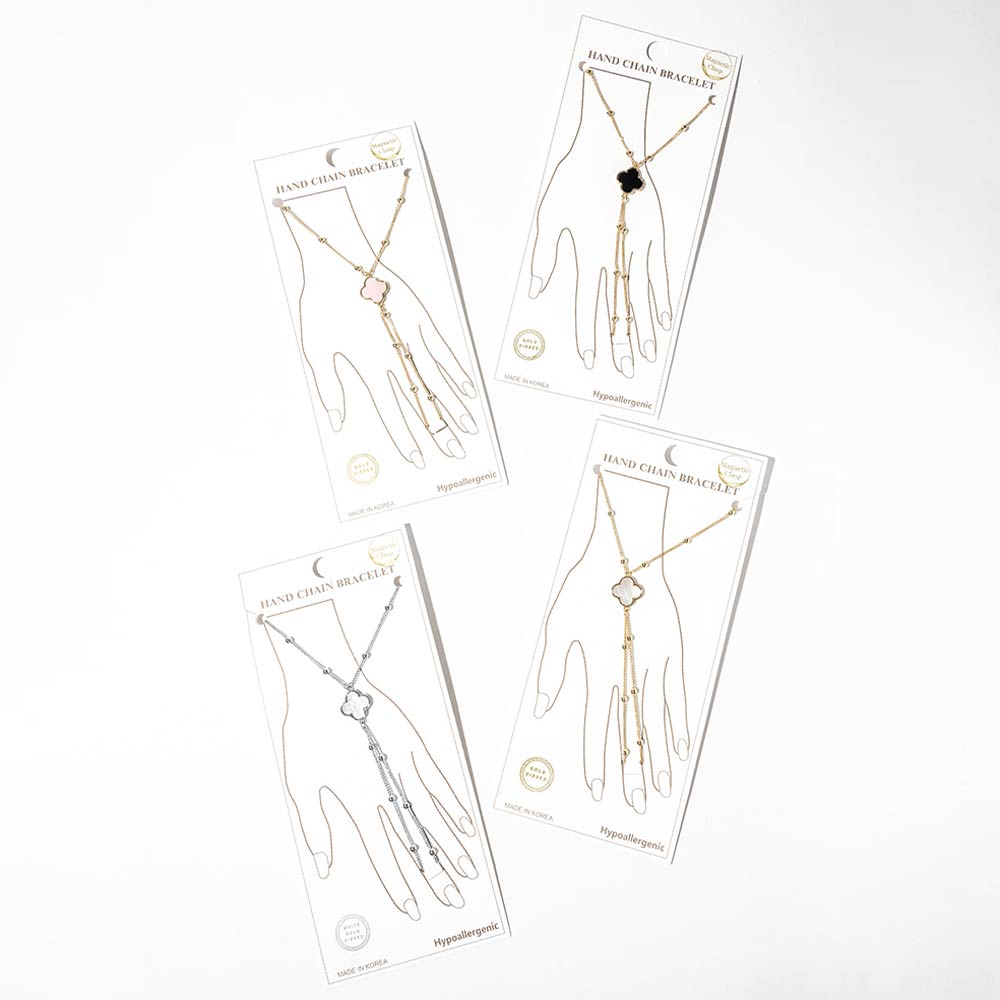 Details • Size : 0.8" H, 7" + 0.25" L • Ring Size : Free • Magnetic Clasp Closure • This stylish hand chain bracelet features a refined clover quatrefoil creates an elegant layered look. Finished with an easy magnetic clasp for comfortable wear, it adds a chic statement to everyday outfits, special occasions, and curated boutique jewelry collections. Designed to stand out while remaining versatile and wearable. • Gold Dipped • Hypoallergenic • Lead and Nickel Compliant • Made In Korea