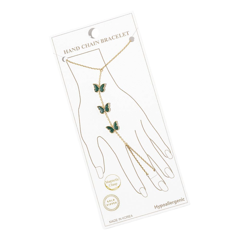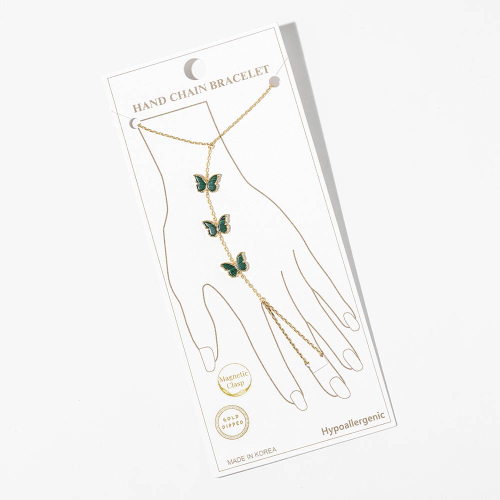 Details • Size : 3" H, 7" + 0.25" L • Ring Size : Free • Magnetic Clasp Closure • This butterfly hand chain bracelet features a delicate wrist-to-finger design accented with butterfly charms for a graceful, eye-catching look. Designed with a magnetic clasp for easy wear, it offers elegant movement and statement appeal. Ideal for boutique jewelry collections, layering styles, and everyday or special occasion accessorizing. • Gold Dipped • Hypoallergenic • Lead and Nickel Compliant • Made In Korea