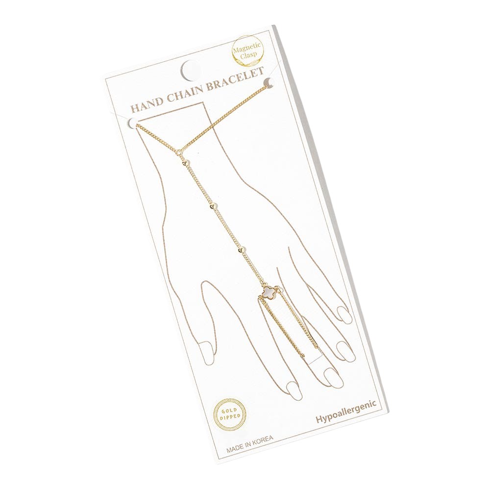 Details • Size : 3" H, 7" + 0.25" L • Ring Size : Free • Magnetic Clasp Closure • This stylish hand chain bracelet features a sleek connected design that links wrist and finger for a modern, fashion-forward look. Designed with an easy magnetic clasp for quick wear, it offers a delicate statement ideal for everyday outfits, special occasions, and trend-driven boutique collections. Perfect for customers seeking unique, minimalist hand jewelry with effortless elegance. • Lead and Nickel Compliant • Hypoallergenic • Made In Korea • Gold Dipped
