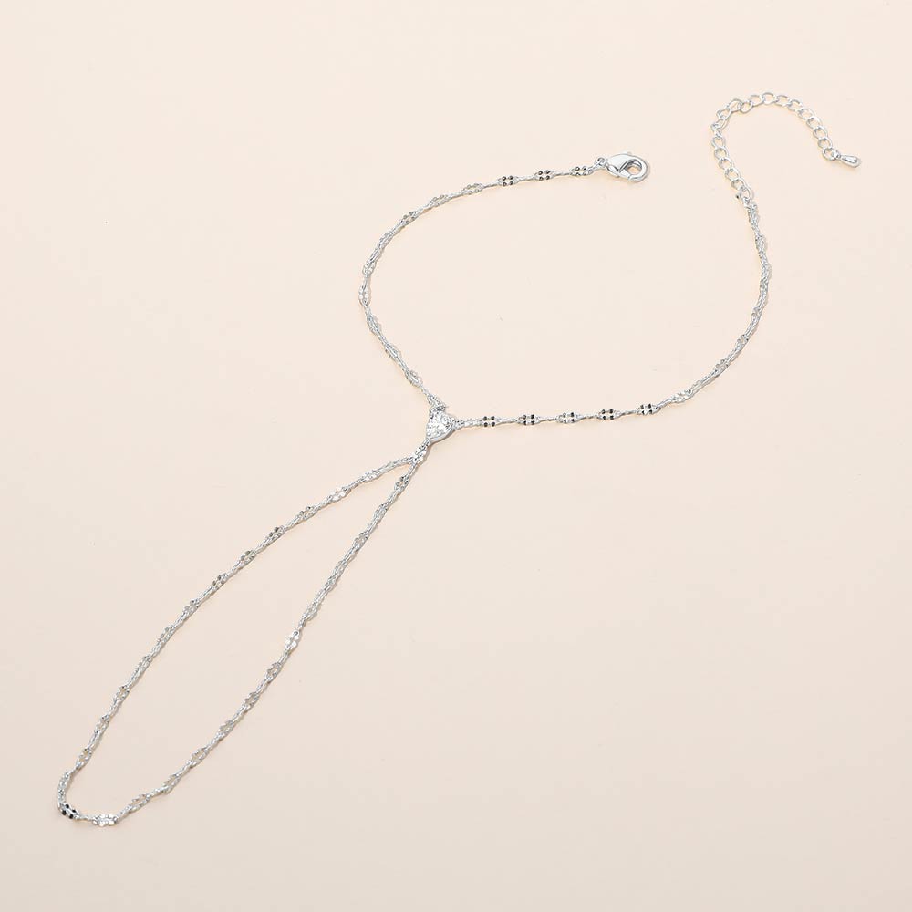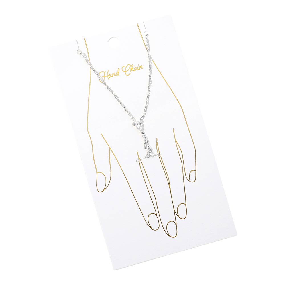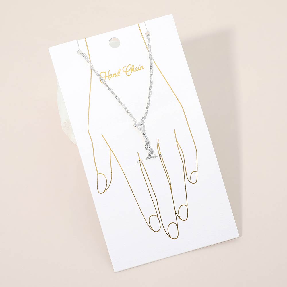 Details • Size : 4" H, 7.5" + 2.25" L • Ring Size : Free • Elegant hand chain bracelet designed with a delicate wrist chain and connected finger loop for a refined silhouette. Features a subtle accent detail that adds gentle shine without overpowering. Ideal for boutique collections, gifting, or everyday styling, this lightweight piece layers beautifully and offers a modern, graceful jewelry look. • Made In Korea